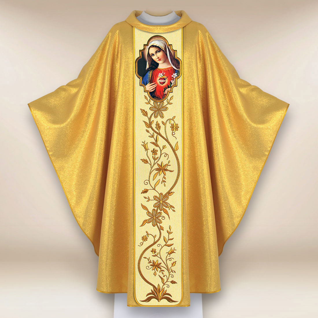 Casula con immagine Cuore di Maria è un paramento liturgico dal carattere solenne e maestoso, realizzato in elegante tessuto con un sottile lucido, che si adatta splendidamente durante la celebrazione. Al centro si trova l’immagine di Maria, collocata su un pannello decorativo, trasferita sul tessuto con una tecnica moderna che garantisce eccezionale durata e profondità dei colori. L’immagine è circondata da un ricco motivo vegetale, finemente ricamato con filo d’oro, creando una composizione armoniosa e serena che richiama lo stile classico dei paramenti liturgici. Il tessuto è leggero, morbido e si adatta elegantemente durante il movimento, assicurando comfort sia durante le celebrazioni quotidiane che in occasioni più solenni. Grazie alla combinazione di ricamo e stampa precisa, la casula si distingue per la sua durata, la profondità del colore e la finitura estetica. La tonalità dorata conferisce un alone di splendore, rimanendo al contempo armoniosa e bilanciata.