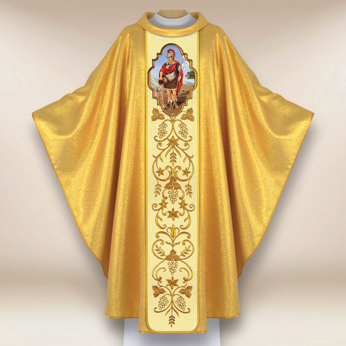 Casula con immagine di San Floriano è un paramento liturgico destinato alle celebrazioni patronali, ai servizi religiosi dei vigili del fuoco e alle celebrazioni legate alla preghiera per i servizi di protezione della vita e dei beni. L’immagine centrale di San Floriano lo rappresenta nella tradizionale iconografia come patrono dei vigili del fuoco e intercessore in situazioni di pericolo. L’immagine è circondata da un elegante orlo ricamato con filo dorato, ricco di ornamentazioni floreali che conferiscono alla casula un carattere unico e una profondità solenne.