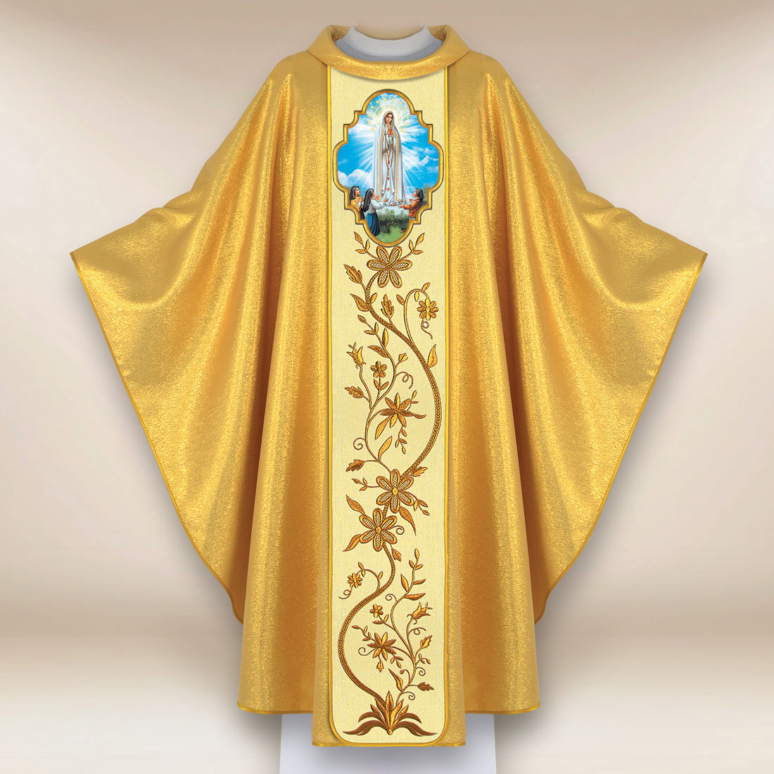 La parte centrale della casula è decorata con l’immagine della Madonna di Fatima insieme ai bambini, trasferita con una moderna tecnologia di applicazione dell’immagine sul tessuto. Questo garantisce un’alta qualità dei dettagli, intensità dei colori e resistenza all’uso. L’immagine è circondata da una composizione classica di motivi vegetali ricamati, realizzati con filo dorato su una fascia decorativa, conferendo alla veste un carattere armonioso e liturgico.