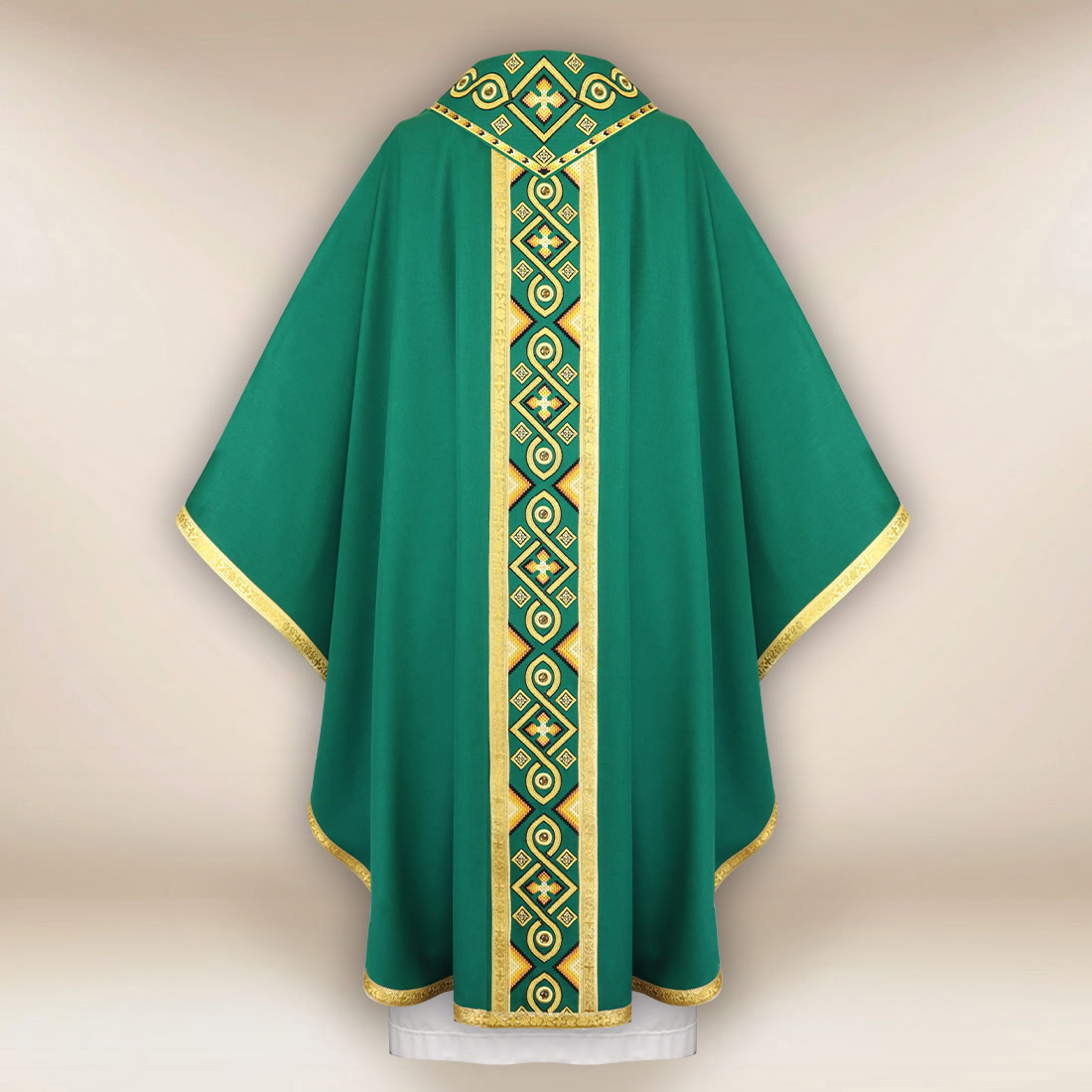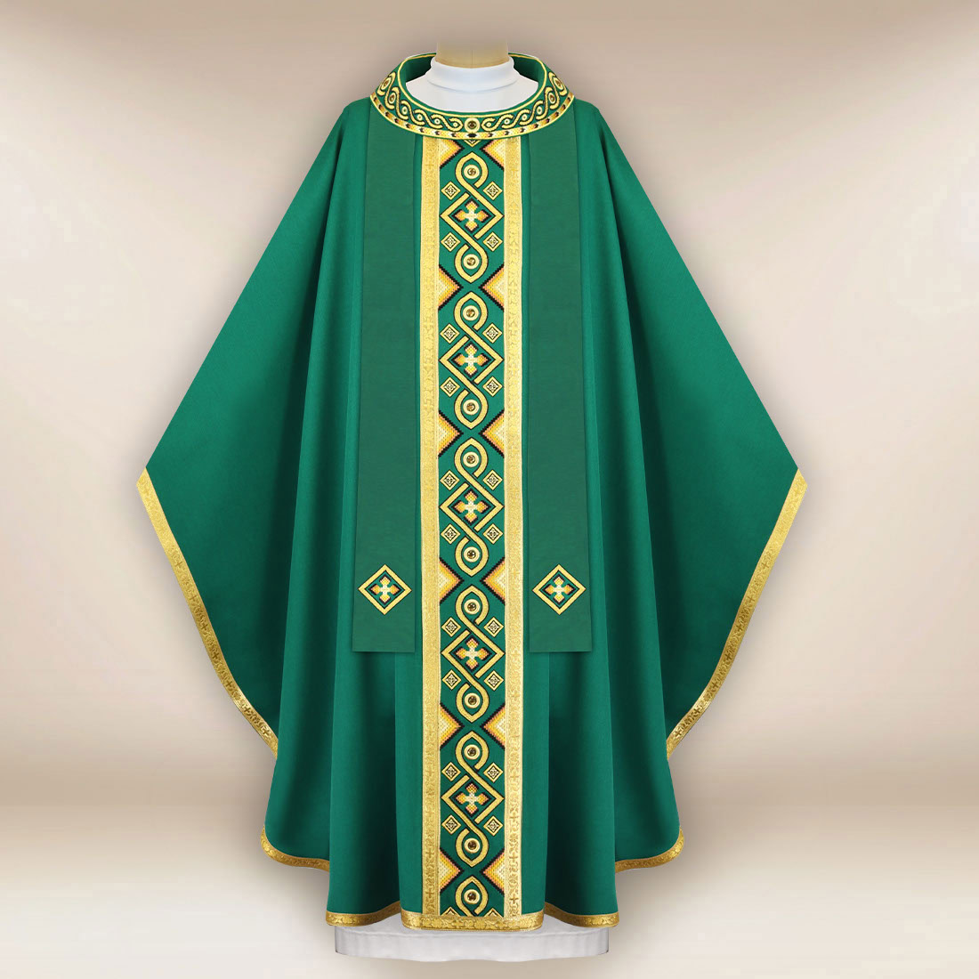 È inclusa una stola interna coordinata, mantenuta nella stessa stilistica. La sua presenza consente di mantenere la coerenza liturgica e aggiunge armonia all’insieme. Il taglio universale della casula fa sì che il vestito si adatti naturalmente a ogni sacerdote, garantendo comfort e libertà di movimento, particolarmente importanti durante le celebrazioni più lunghe.