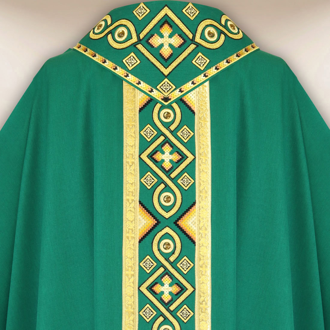 Le decorazioni creano una composizione curata, in cui si uniscono armoniosamente il gallone ornamentale e il colletto elegante. Le linee del ricamo sono state progettate per sottolineare la silhouette verticale del vestito e creare una profondità visiva, caratteristica dei tessuti liturgici di alta classe. I ricami sono stati eseguiti con precisione e attenzione ai dettagli – ogni elemento dell’ornamento si integra in un insieme coerente ed estetico, sottolineando il carattere solenne della celebrazione. La finitura con passamaneria decorativa completa il progetto, creando l’impressione di un’opera piena, elegante e bilanciata.