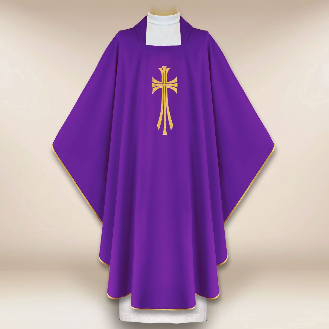 Casula ricamata Croce viola è dotata di una stola interna coordinata mantenuta nella stessa stilistica. La taglia universale garantisce una vestibilità comoda su ogni sacerdote, sottolineando il carattere liturgico della celebrazione. È un modello senza tempo, che favorisce la concentrazione nella preghiera e sottolinea la gravità dei periodi di preparazione spirituale.