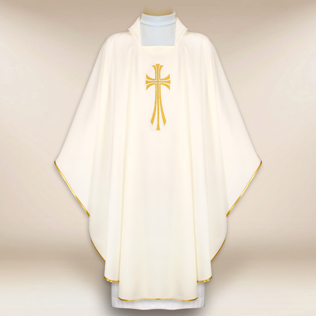 Casula ricamata Croce ecru è una veste liturgica progettata per le celebrazioni in cui luminosità, purezza e solennità creano l’adeguata cornice per la preghiera. Il colore ecru simboleggia la luce, la gioia e il rinnovamento, mentre il ricamo centrale della croce introduce un accento equilibrato di simbolismo sacro. Questo motivo, semplice e chiaro, ricorda il sacrificio di Cristo e la Sua presenza nella liturgia della Chiesa.