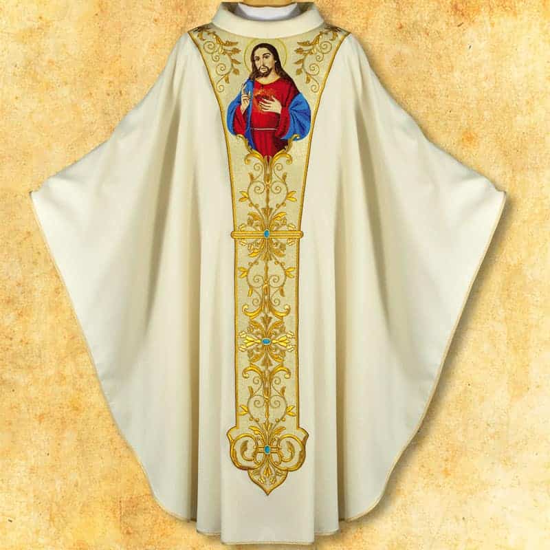 Casula ricamata „Cuore di Gesù” è un vestimento di eccezionale carattere solenne, destinato alle celebrazioni in cui è particolarmente accentuata la spiritualità e il culto del Sacratissimo Cuore di Gesù. Nella parte centrale della fascia è stato collocato un ricamo con l’immagine di Cristo che indica il suo Cuore, conferendo al vestimento una forma di contemplazione orante. Il delicato ornamento attorno alla figura sottolinea il carattere sacro del progetto, mentre le proporzioni armoniose fanno sì che il vestimento si presenti magnificamente sia da vicino che nello spazio del presbiterio.