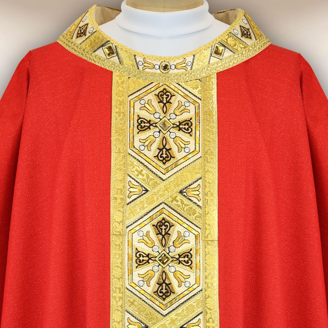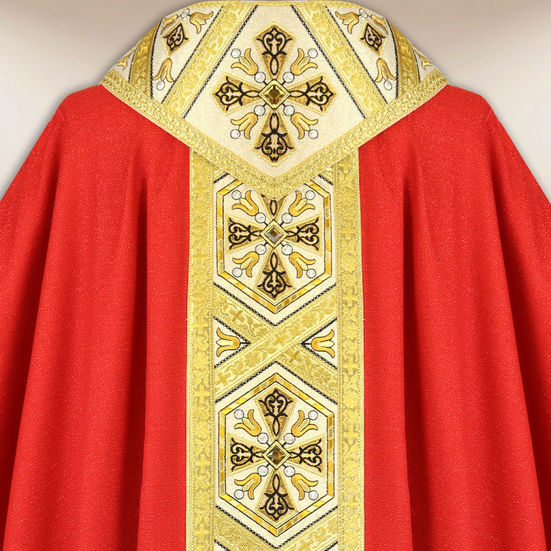 Il motivo delle croci è stato elaborato in modo liturgicamente leggibile e armonioso. La loro distribuzione uniforme crea un ritmo tranquillo, rafforzando la simbolica del sacrificio e della testimonianza. Questa è una delle caratteristiche che rende la casula ricamata rossa con croci una scelta appropriata per celebrazioni di elevato rango, dove la simbolica deve essere sia bella che chiara. Le decorazioni creano una linea visiva estetica, guidando lo sguardo verso le parti centrali dell’abito.