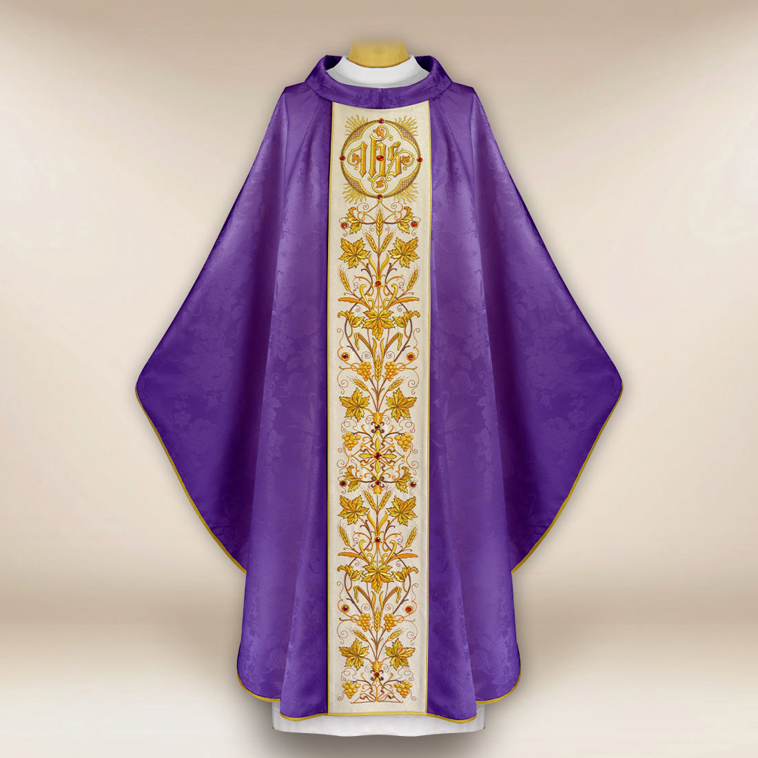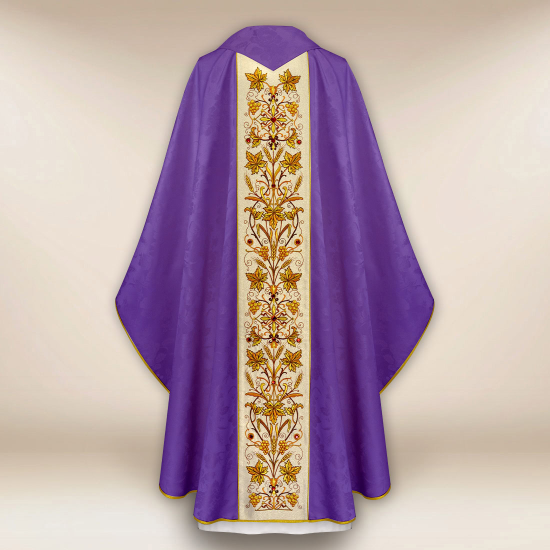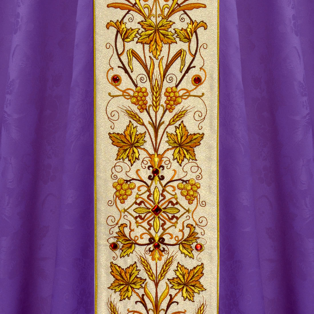 Il gallone centrale è stato ricamato su un tessuto brillante di tipo “Nebbia d’Oro”, le cui sottili riflessioni sottolineano il carattere sacro della veste. Le pietre incastonate a mano rinforzano la luminosità della composizione, conferendole un bagliore unico — sempre in modo liturgicamente equilibrato. L’ornamento è proporzionato e preciso, rendendo la casula sia bella che adatta per le celebrazioni che richiedono di sottolineare la simbologia della penitenza, della conversione e del rinnovamento spirituale.
