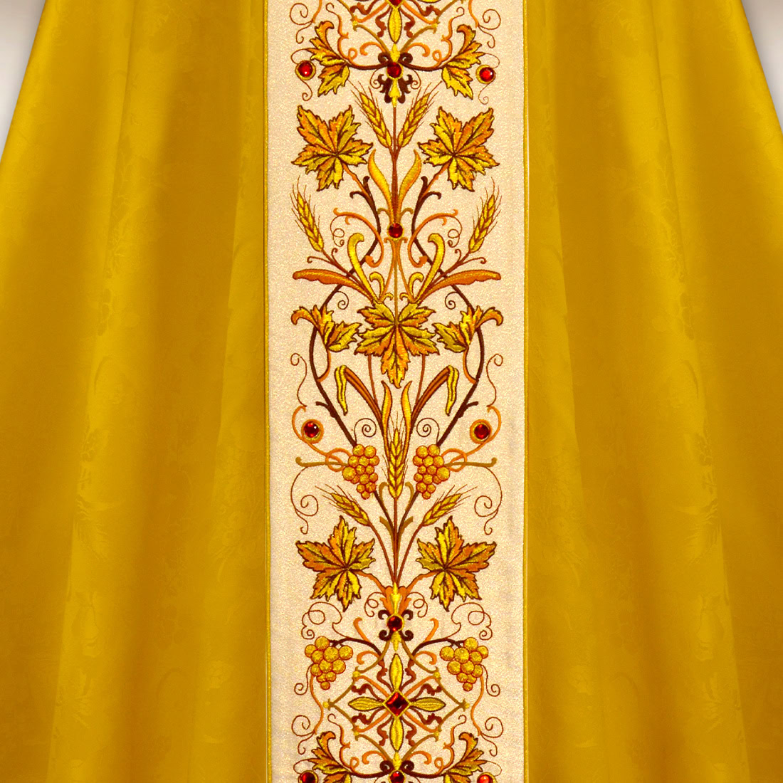 Casula ricamata in jacquard oro, progettata per celebrazioni liturgiche solenni. Il vestimento è realizzato in tessuto jacquard di alta qualità con una struttura elegante e sottile, che si distingue per leggerezza, morbidezza e bellissimo drappeggio durante la Santa Messa. Il motivo decorativo floreale – motivi di rose, spighe, grappoli d’uva e foglie – crea una composizione armoniosa che si inserisce nell’estetica liturgica e nel carattere sacro del vestimento.
