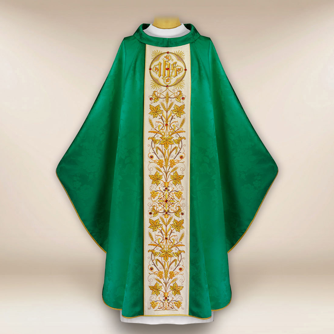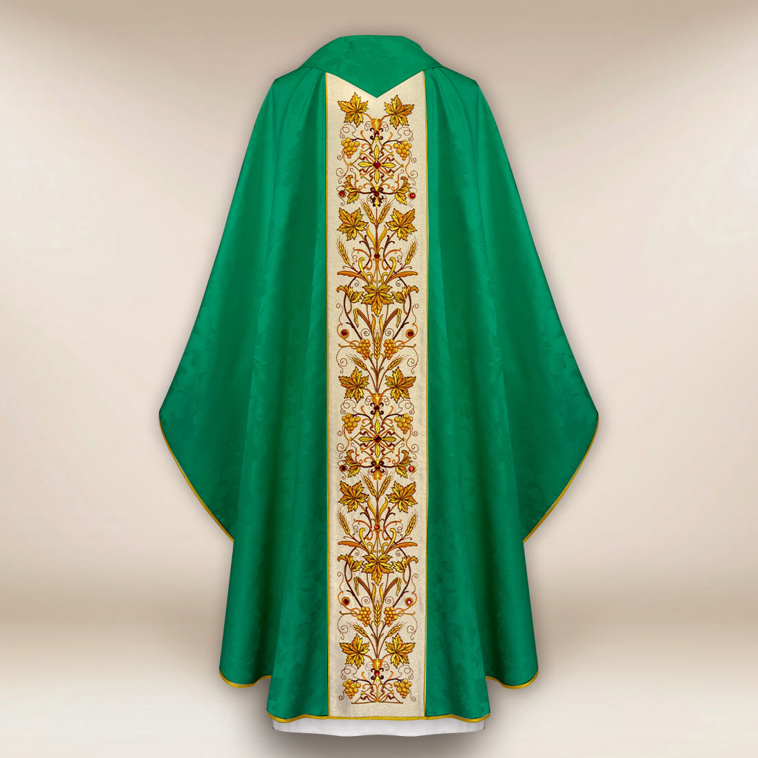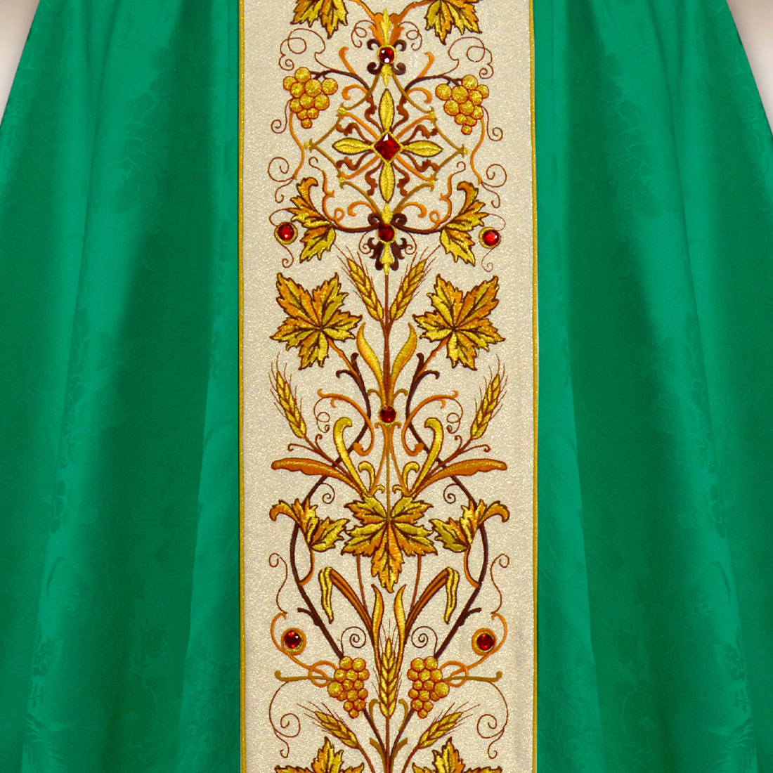 Il gallone centrale è ricamato su un tessuto brillante di tipo “Nebbia d’Oro”. Il suo sottile lucore conferisce luminosità al vestimento, mentre le pietre incastonate a mano riflettono la luce e sottolineano il carattere solenne legato alle celebrazioni nel periodo verde. L’ornamento mantiene le proporzioni, risultando elegante, equilibrato e liturgicamente coerente.