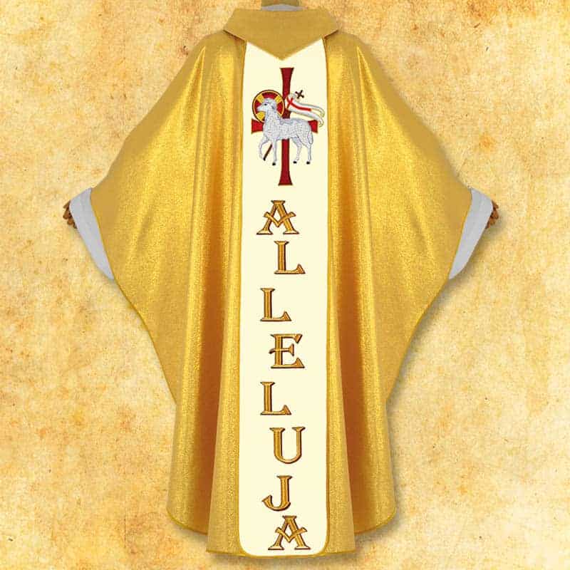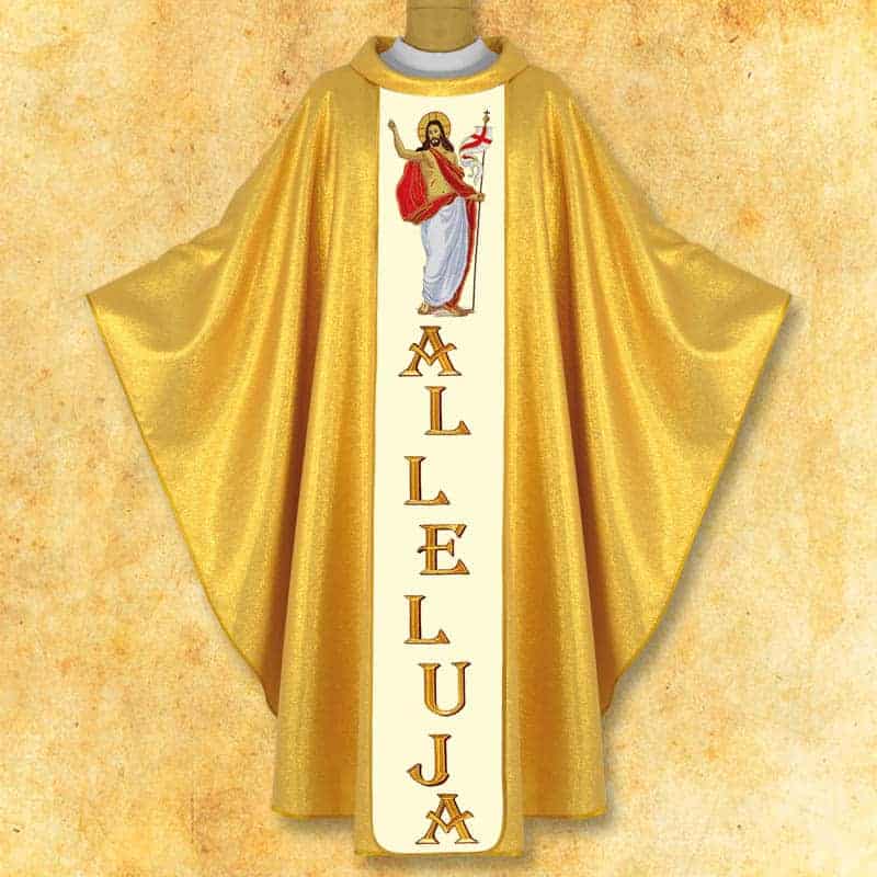 La casula liturgica con il motivo di Gesù Risorto unisce tradizione, significato simbolico ed eleganza, rappresentando una scelta appropriata per le liturgie che accentuano la gioia della Risurrezione e il trionfo di Cristo.