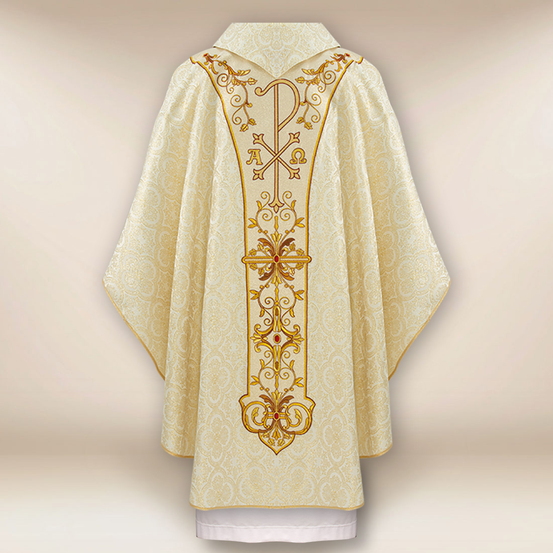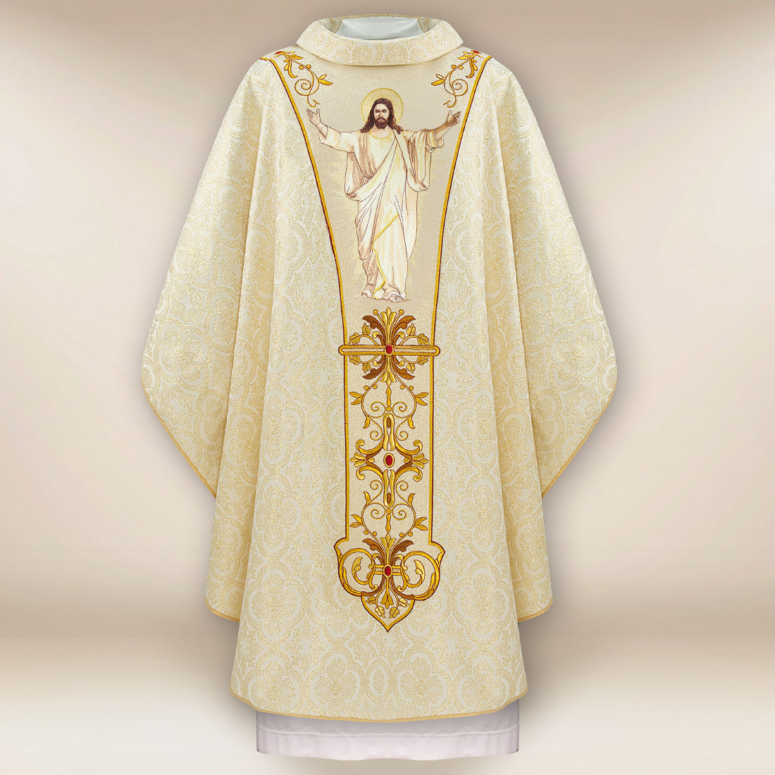 La casula ricamata Gesù Risorto ecru è perfetta per la veglia pasquale, la domenica di Resurrezione, l’ottava di Pasqua e tutte le celebrazioni che sottolineano la gioia della vittoria di Cristo. È una casula che unisce la bellezza classica, il simbolismo della Resurrezione e l’alto livello dell’artigianato liturgico.