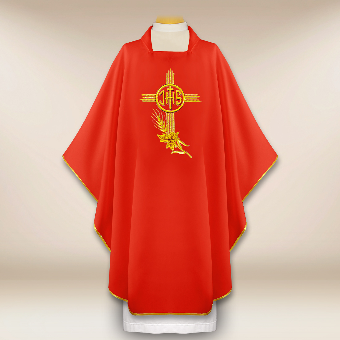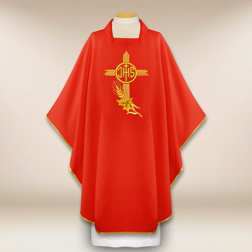 Casula ricamata IHS è una veste liturgica in cui la bellezza classica del design sacro si unisce all’eleganza e al comfort dei materiali moderni. Il ricamo centrale con il monogramma IHS – uno dei simboli più riconoscibili di Cristo – introduce un chiaro accento eucaristico, sottolineando la dimensione spirituale di ogni celebrazione.