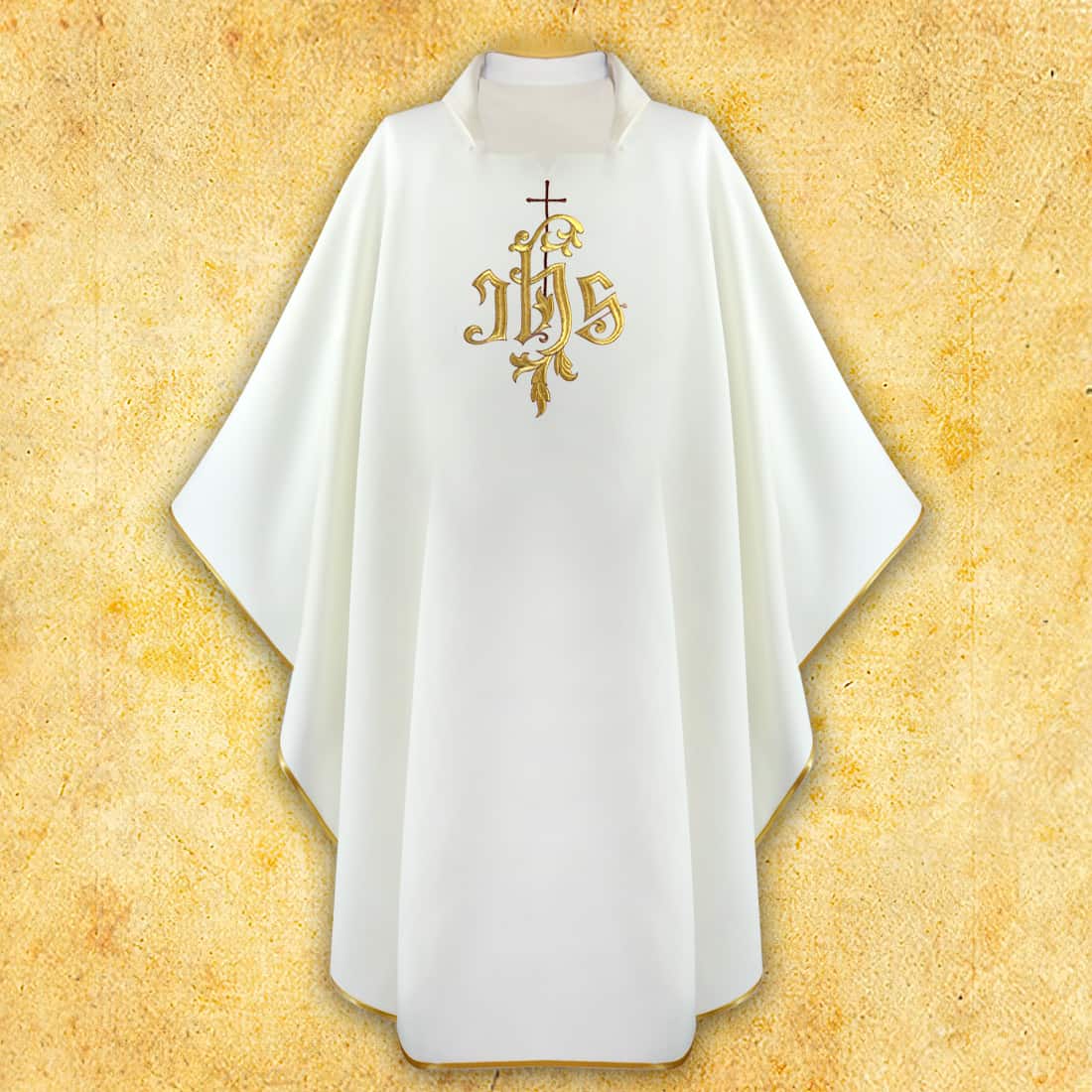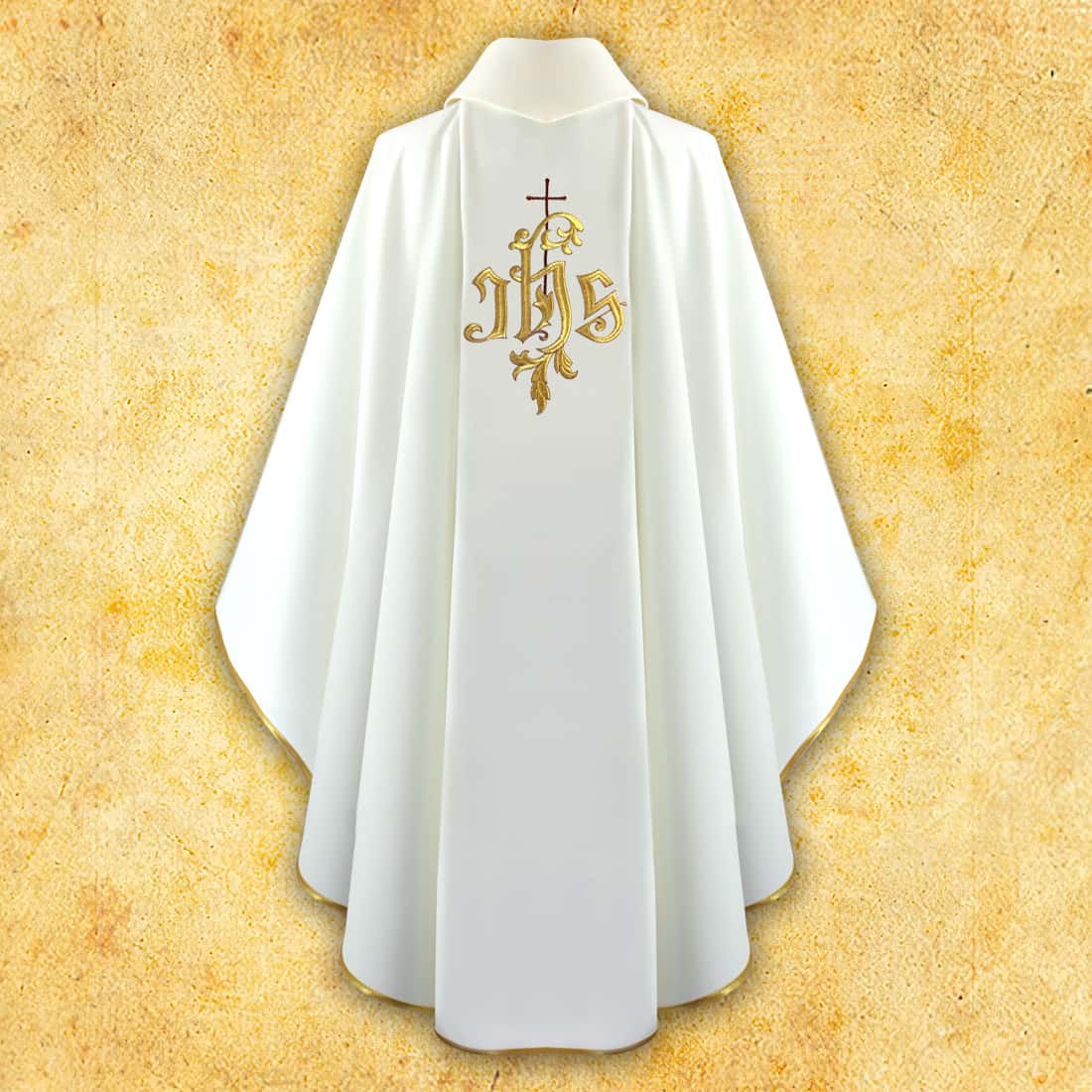 Casula ricamata IHS è una classica veste liturgica di forma elegante e pura, decorata con il motivo simbolico IHS, che da secoli esprime venerazione per il Nome di Gesù. Il ricamo è stato realizzato con straordinaria precisione: le lettere IHS avvolte in delicata ornamentazione e sormontate da una croce creano una composizione di forte dimensione spirituale. Questa rappresentazione così minimalista, ma al contempo profonda, si adatta perfettamente alle celebrazioni eucaristiche e alle solennità che richiedono un’estetica calma e sobria.