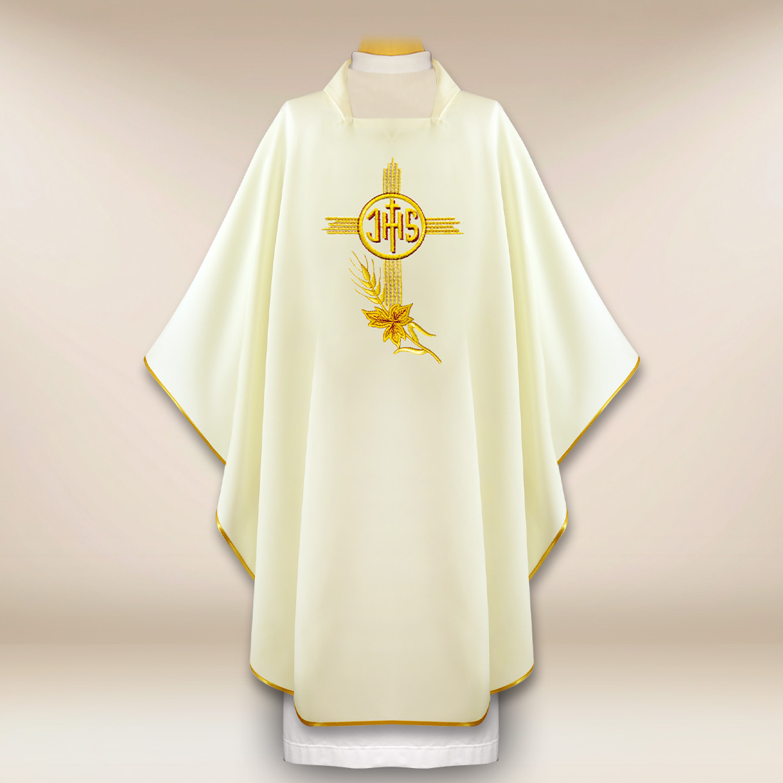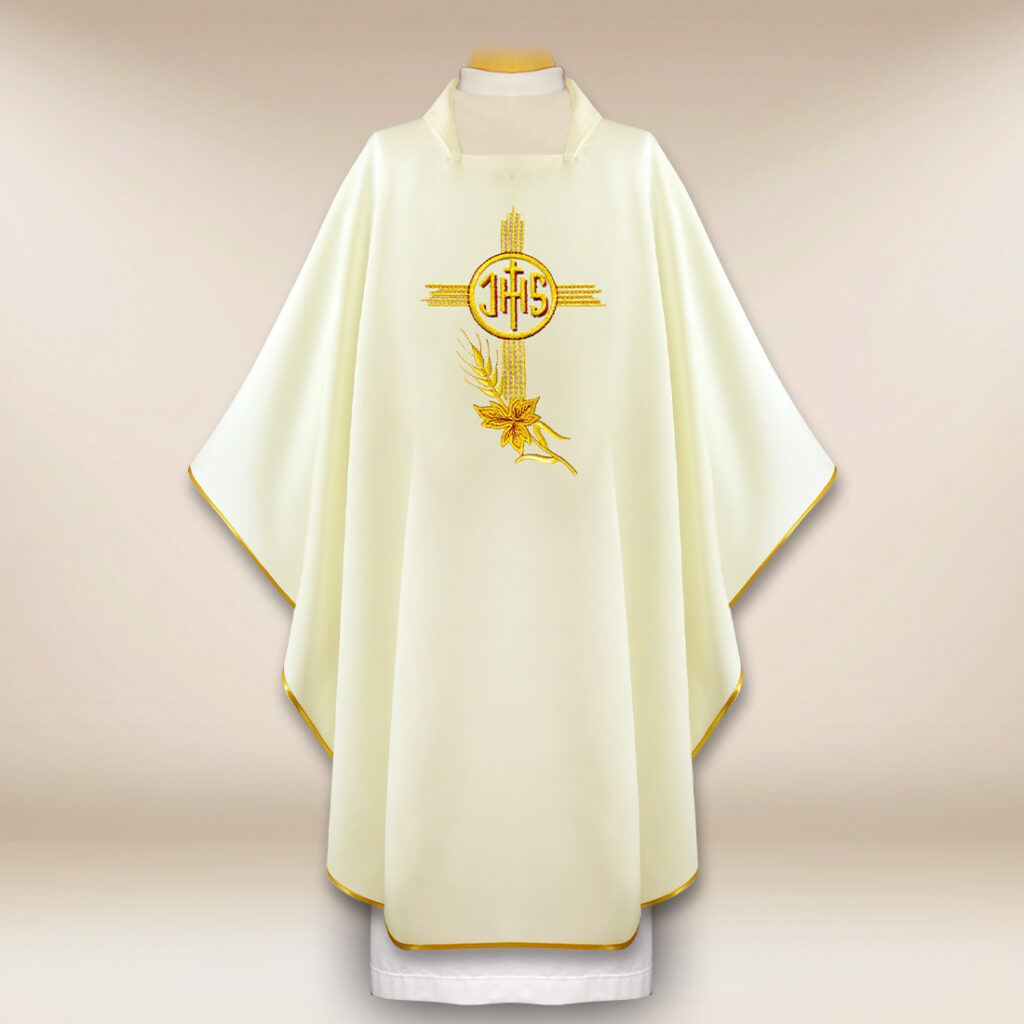 Il ricamo centrale IHS con sottili accenti ornamentali sottolinea il carattere eucaristico della veste, conferendole un’eleganza sacra e bilanciata.