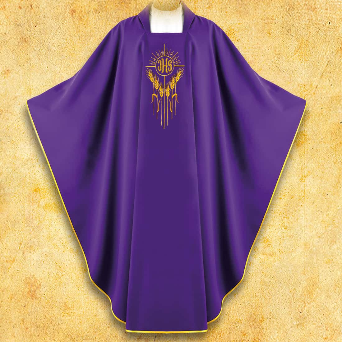 L’elemento decorativo centrale è il monogramma IHS ricamato circondato da kłosami, che simboleggiano il pane eucaristico, il sacrificio e il nutrimento spirituale della Chiesa. I fili dorati contrastano splendidamente con il profondo tessuto viola, conferendo al paramento un carattere distintivo e sacro. Le linee sottili del ricamo creano una composizione che mantiene un equilibrio tra simbolismo tradizionale e semplicità elegante.