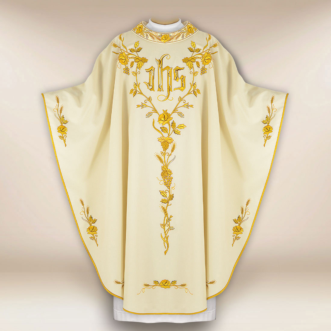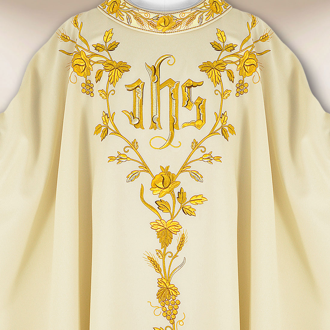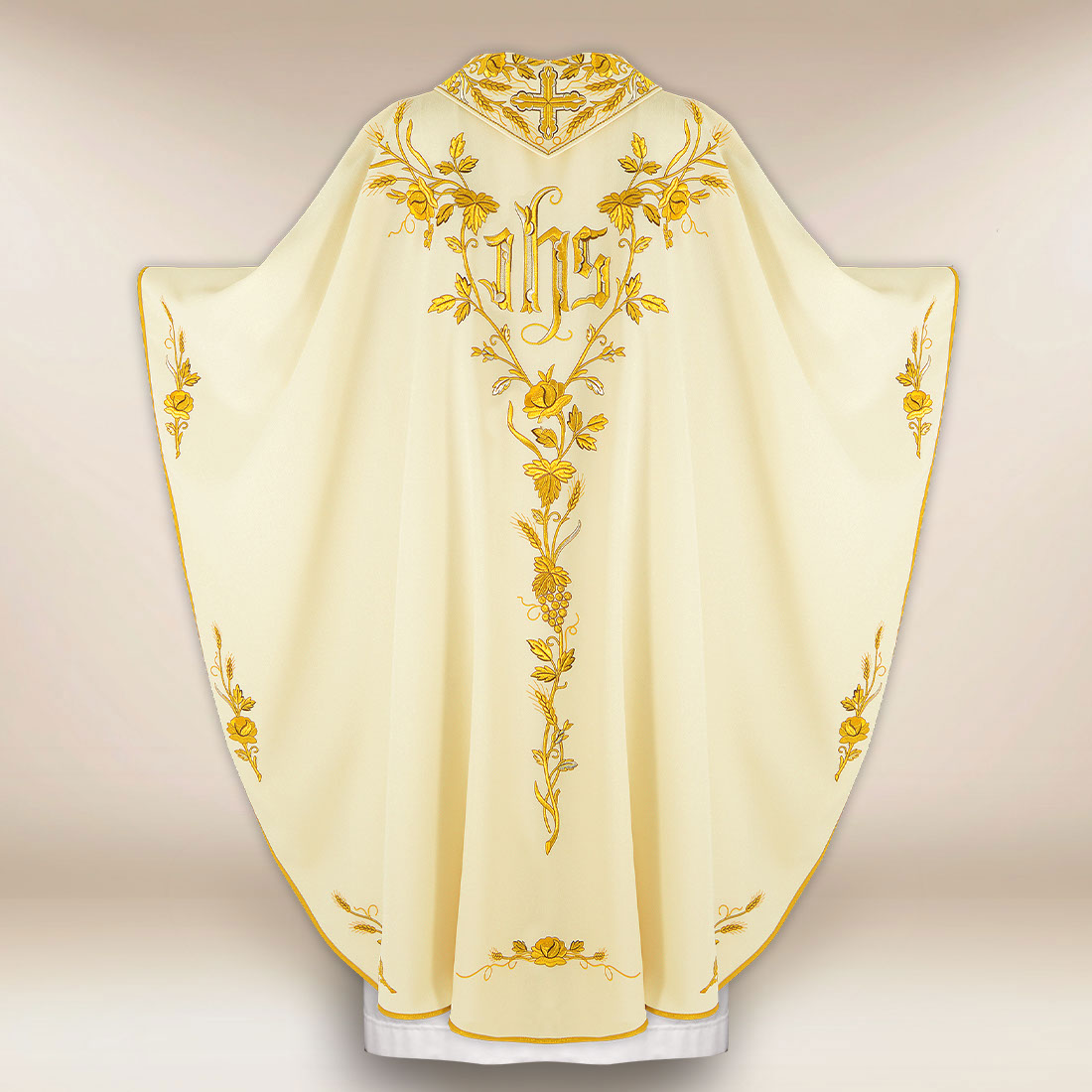 Casula liturgica con ricamo IHS è una proposta per i sacerdoti che desiderano unire eleganza, bellezza classica e profonda simbolica liturgica. L’ornamento centrale della veste è il ricamo IHS – segno del nome di Cristo, che da secoli accompagna la liturgia ed è presente nella sua iconografia. Posizionato sia sul davanti che sul retro, circondato da una composizione vegetale, crea un’asse armoniosa del progetto e conferisce alla casula un carattere sacro e distintivo. Questo è il significato che dovrebbe portare una veste definita come casula liturgica con ricamo IHS, sottolineando la profondità teologica della celebrazione.