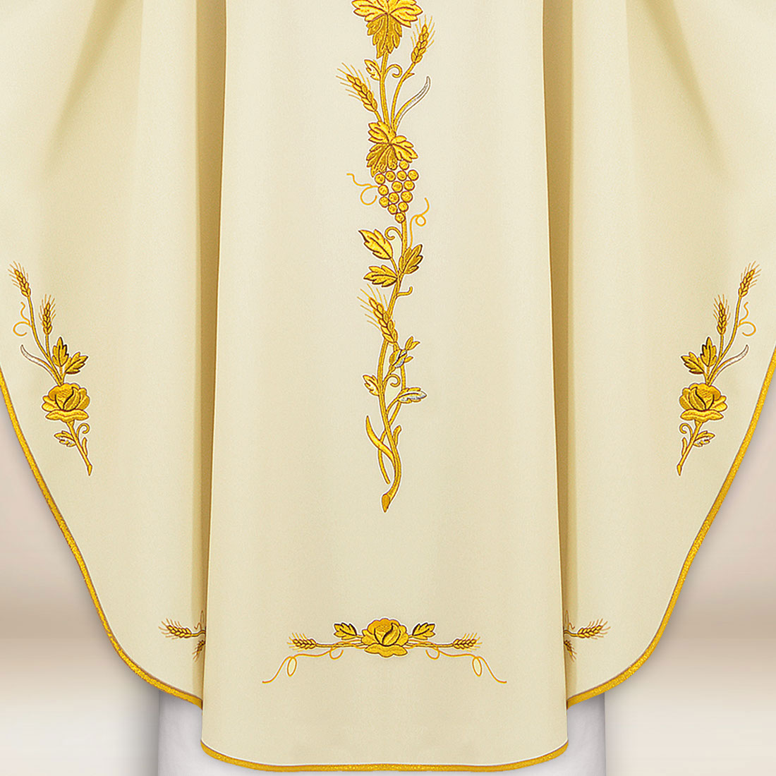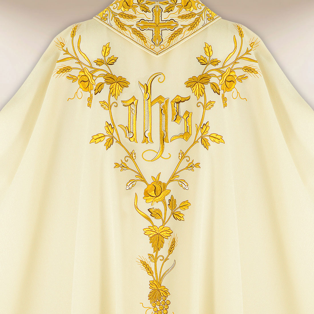 Il ricamo è realizzato con la precisione caratteristica delle vesti liturgiche di alta classe. I motivi vegetali si dispongono in una delicata linea decorativa proporzionata, creando una bella cornice per il monogramma IHS. I fili riflettono la luce in modo sottile, creando un effetto luminoso e sottolineando la dimensione sacra della veste. Le rifiniture posizionate sulle maniche, sul colletto e sulla parte inferiore della veste sono state curate con attenzione alle proporzioni, rendendo l’intero progetto caratterizzato da un’armonia eccezionale.