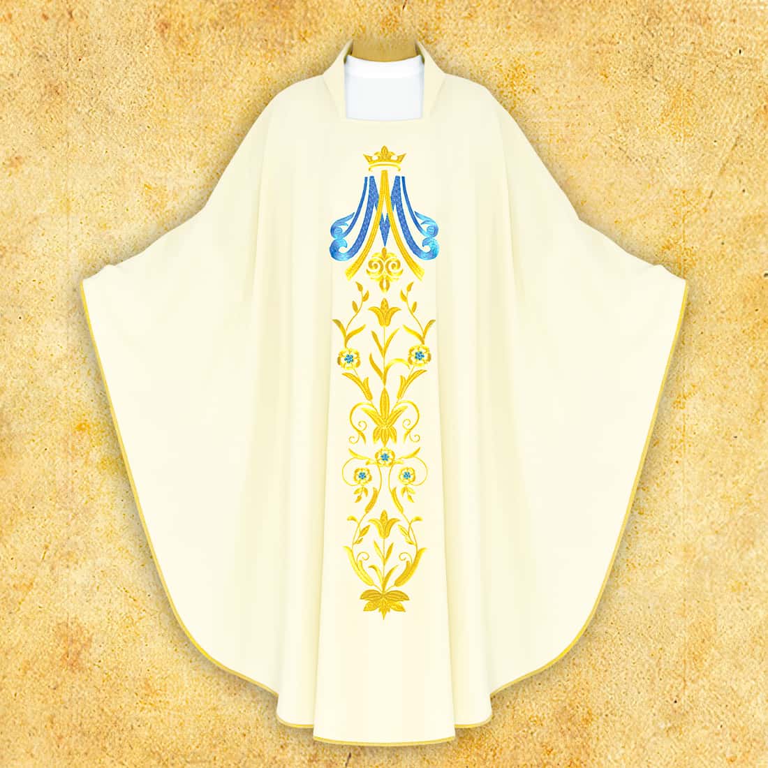 Il tessuto utilizzato combina fibre naturali e sintetiche, rendendolo durevole, resistente alle pieghe e facile da mantenere. Casula ricamata Mariana mantiene un aspetto elegante anche con un uso intenso, rendendola una scelta eccellente per le parrocchie in cerca di vesti liturgiche di alta qualità.