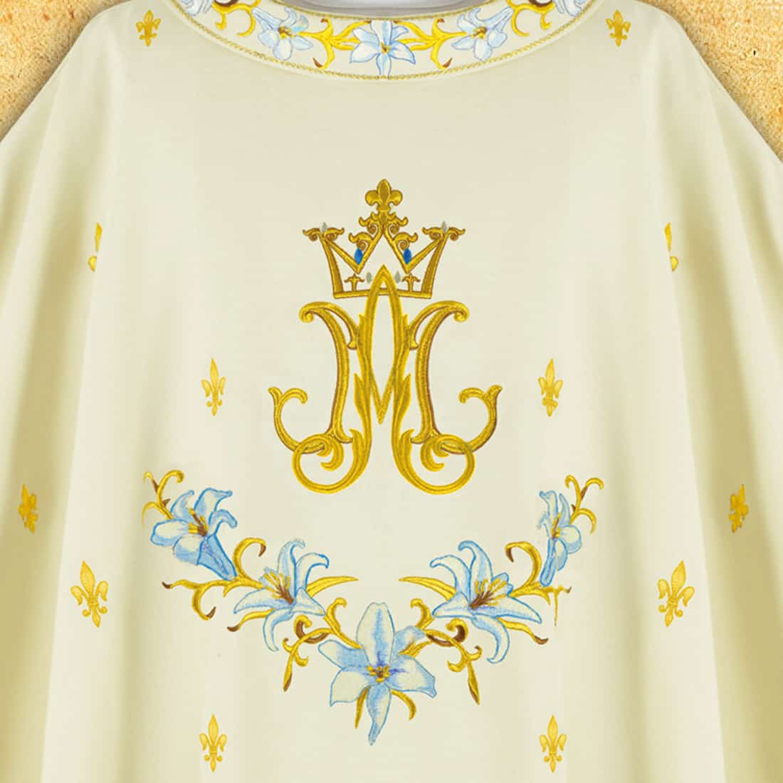 La casula è decorata con un ricamo mariano posizionato sul fronte e sulla schiena. La composizione del ricamo è stata progettata per enfatizzare la disposizione verticale dell’abito e guidare lo sguardo verso il centro della simbologia. I fili di tonalità dorata conferiscono all’ornamento liturgico espressione senza eccessiva decoratività, mantenendo un equilibrio tra ornamento e semplicità.