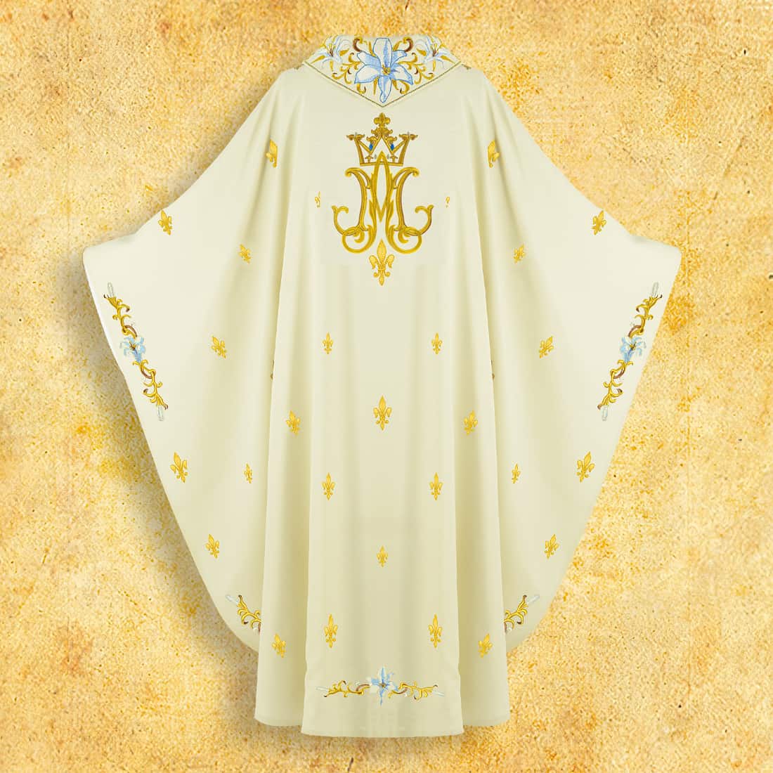 La casula liturgica mariana in colore ecru è universale, adattata a silhouette di diverse stature, il che consente un uso libero nel servizio quotidiano. La casula si adatta sia a celebrazioni solenni mariane, a devozioni del rosario, a festività mariane, che a momenti speciali di preghiera e ringraziamento.