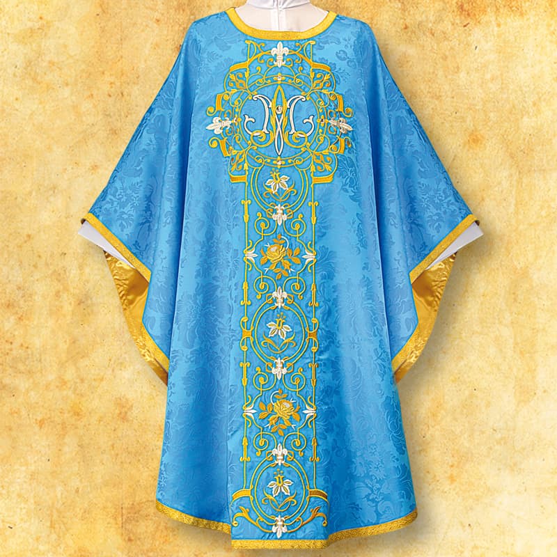 Casula mariana ricamata blu è un’eccezionale veste liturgica creata per le celebrazioni mariane, in onore della Madre di Dio e in tutti i momenti in cui si sottolinea la profondità spirituale e la bellezza sacra. Realizzata in tessuto jacquard di alta qualità con un delicato motivo floreale, incanta per la leggerezza, il sottile lucido e la naturale caduta durante il movimento. Il materiale è morbido, confortevole e durevole, garantendo che la veste mantenga il suo aspetto impeccabile anche con un uso intenso.