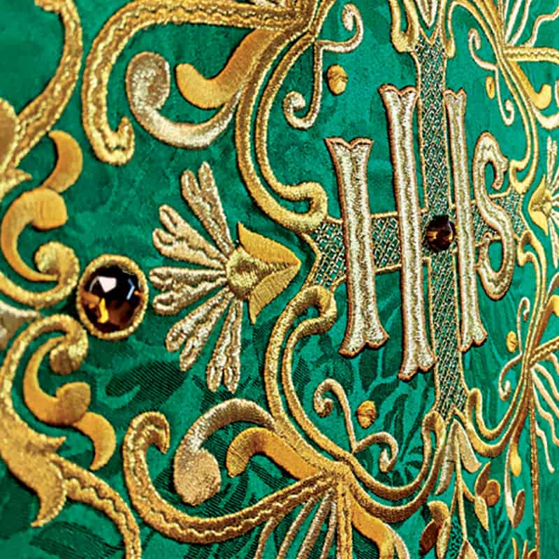Casula ricamata verde con IHS realizzata in tessuto jacquard di alta qualità con una sottile trama floreale, che conferisce alla veste una nobile profondità ed eleganza. La struttura del tessuto assicura una disposizione armoniosa della veste durante il movimento, particolarmente importante durante le celebrazioni solenni. Il ricamo IHS – simbolo del Nome di Gesù – è stato elaborato con cura per le proporzioni e la composizione, in modo da mantenere la sua leggibilità teologica e la dignità sacra. Le pietre incastonate a mano introducono un accento di luce, sottolineando l’importanza del segno senza eccessiva decorazione.
