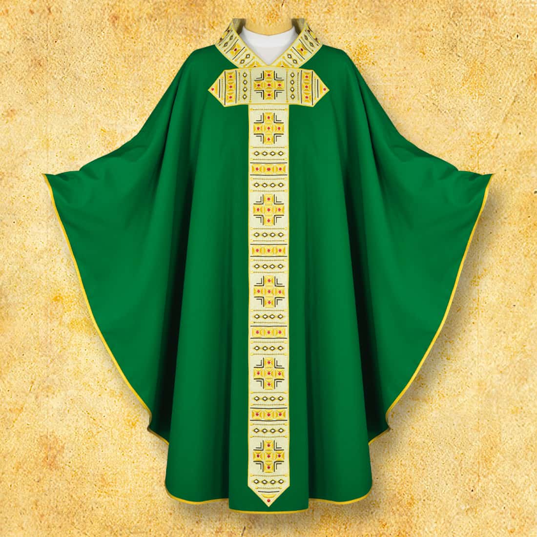 La casula ricamata verde è una veste liturgica elegante dallo stile classico e armonioso, realizzata con tessuti di alta qualità che uniscono i vantaggi delle fibre naturali e sintetiche.