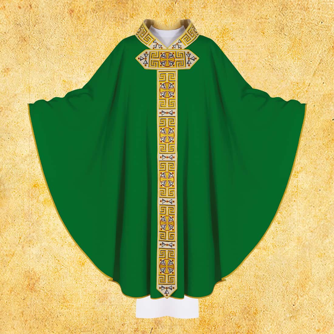 Casula liturgica verde è disponibile in taglia universale, soddisfacendo così le esigenze di ogni sacerdote, risultando adatta sia per celebrazioni quotidiane che per liturgie solenni.