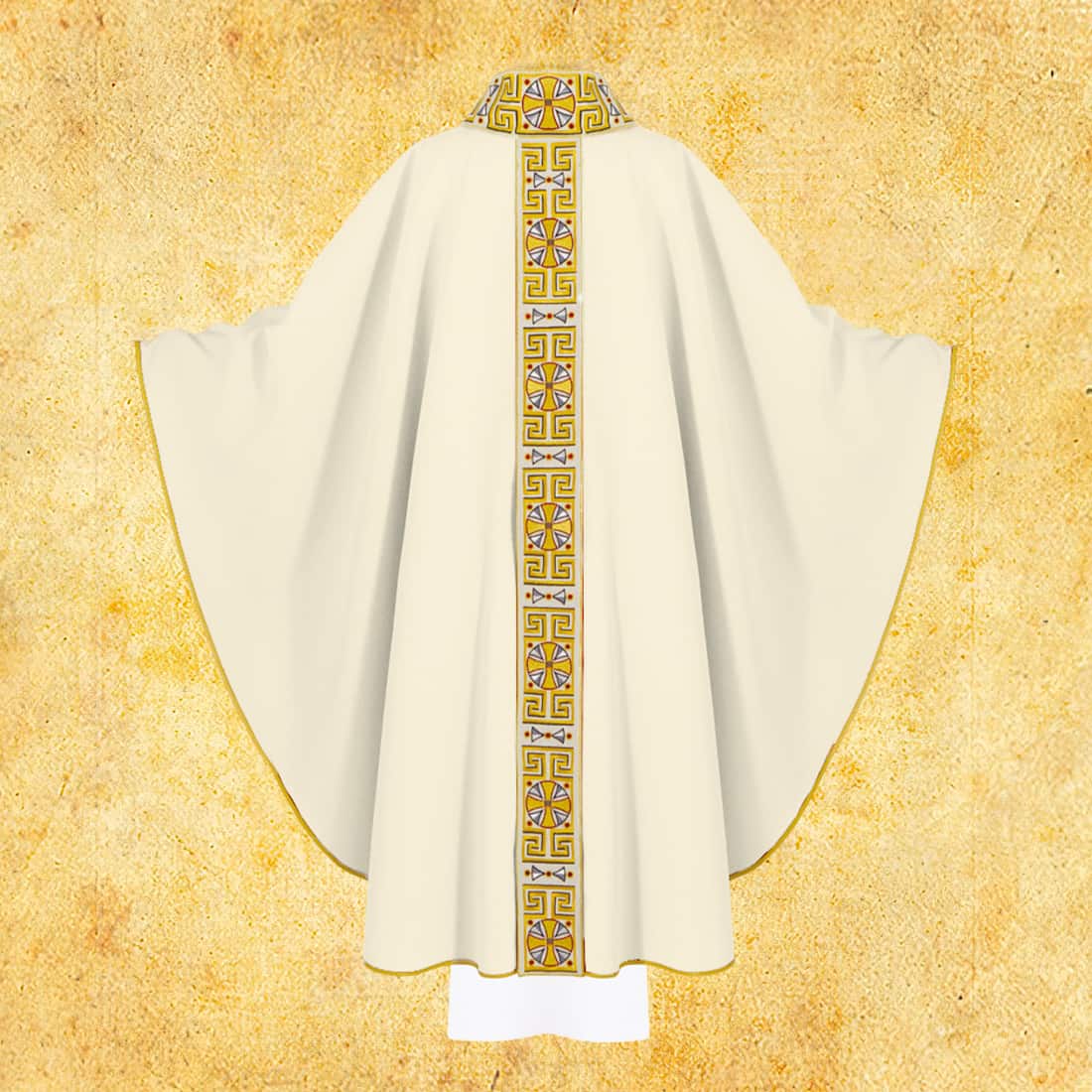 Il ricamo è stato realizzato con attenzione ai dettagli, rendendo l’ornamento leggibile sia da vicino che dalla prospettiva dei fedeli. Il progetto arricchisce anche il colletto ricamato, che unisce l’intera composizione e conferisce al vestito una dignità unica. È inclusa una stola interna coordinata, creando un insieme visivamente e liturgicamente coerente.