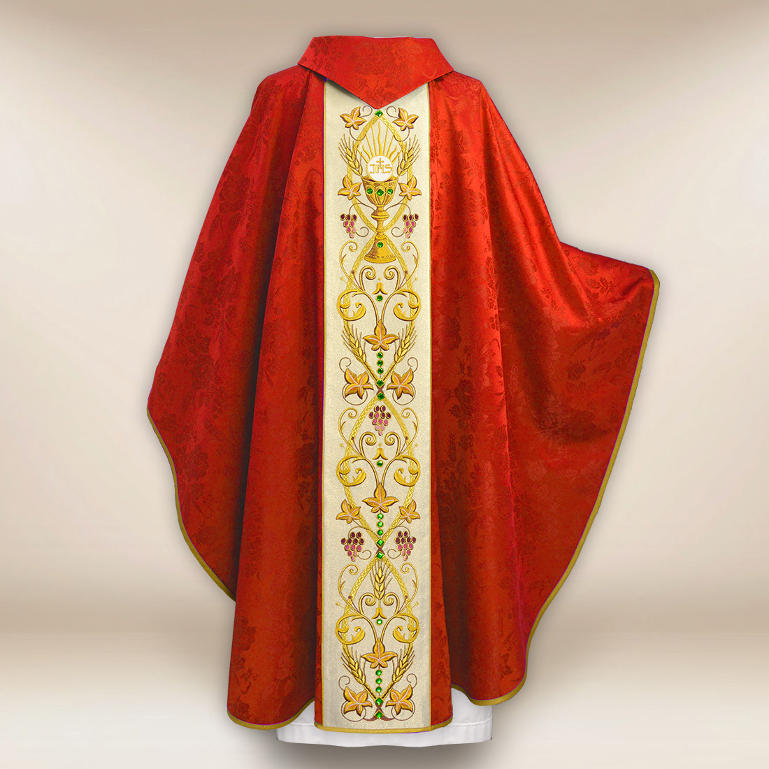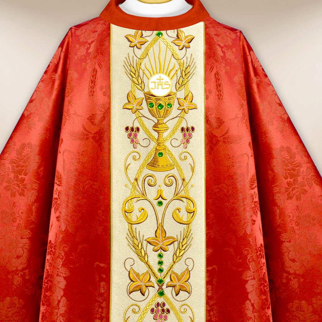Il gallone centrale, creato su un tessuto chiaro e luminoso definito come Nebbia Dorata, costituisce il cuore della composizione. Il motivo del calice è racchiuso in un ornamento di grappoli d’uva, spighe e motivi eucaristici stilizzati, elaborati con la precisione caratteristica dello studio Urbanowicz Haft Polska. Le pietre incastonate a mano aggiungono un delicato splendore al gallone, che contrasta splendidamente con il rosso del paramento, senza compromettere la sua serietà liturgica.