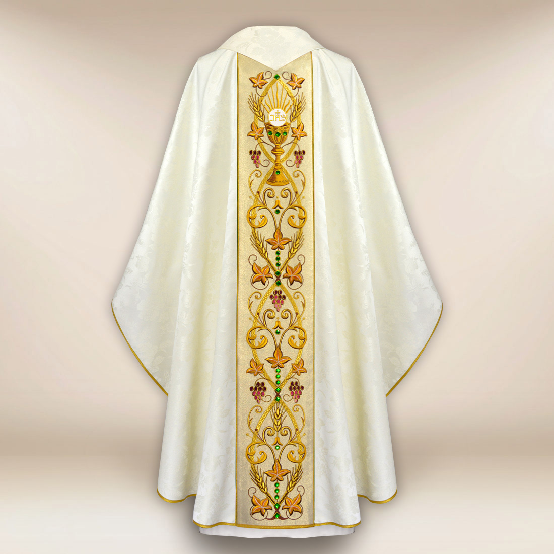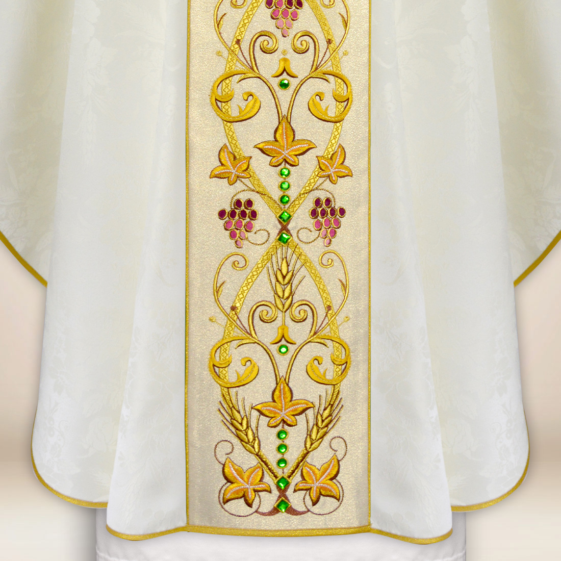 Il set include una stola interna abbinata realizzata con lo stesso tessuto, garantendo una piena coerenza visiva e liturgica. Il modello „Prelato” in colore ecru è stato progettato per i sacerdoti che desiderano unire la bellezza classica dei simboli eucaristici con un’estetica chiara ed elegante del paramento.