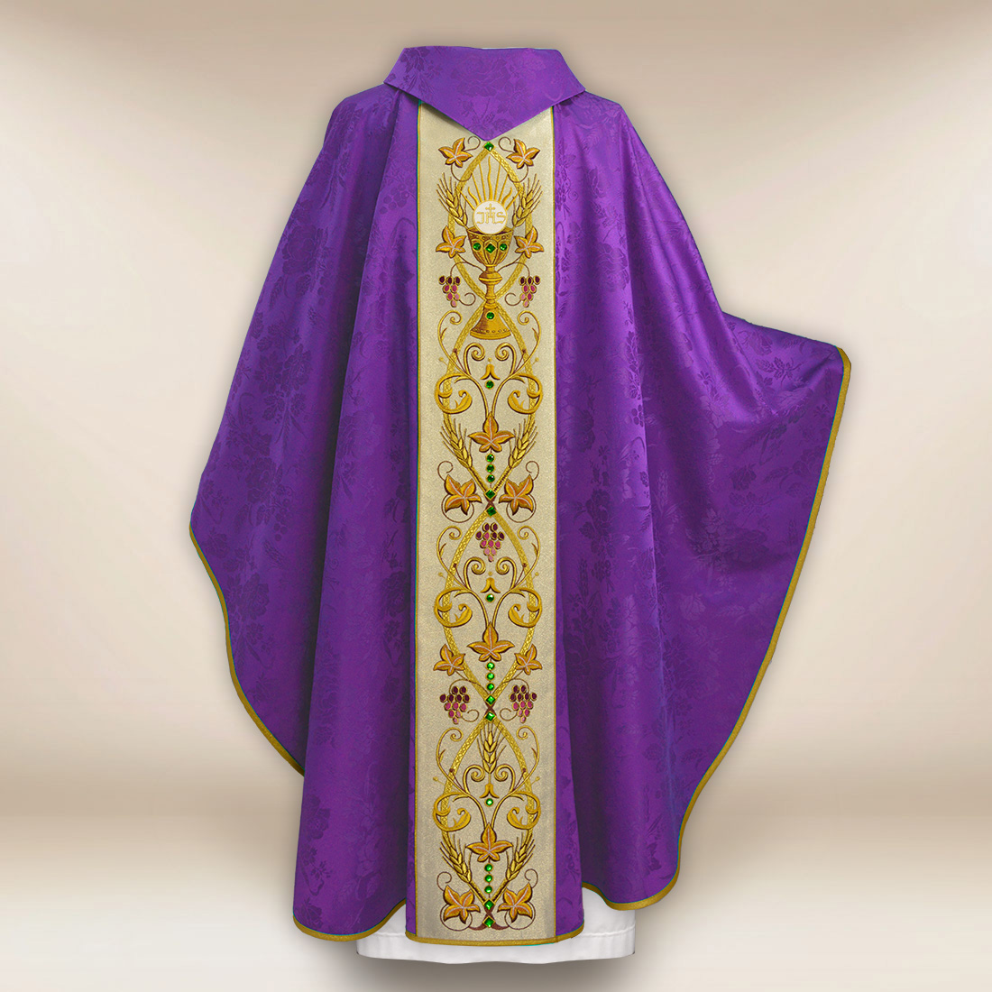 L’elemento centrale è un ricco gallone, elaborato su un tessuto con finitura chiara e luminosa, chiamata nella bottega Nebbia d’Oro. Gli ornamenti realizzati con precisione rappresentano grappoli d’uva, spighe e motivi eucaristici, creando un’iconografia coerente che si riferisce all’Offerta Eucaristica. La composizione è completata da pietre incastonate a mano, che conferiscono al paramento un nobile e discreto splendore. La loro disposizione non è opprimente, ma sottolinea sottilmente il significato dei simboli.