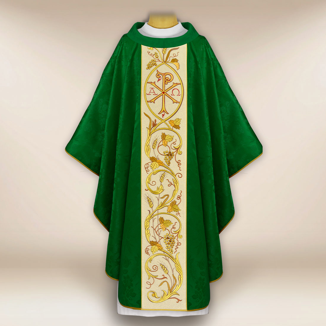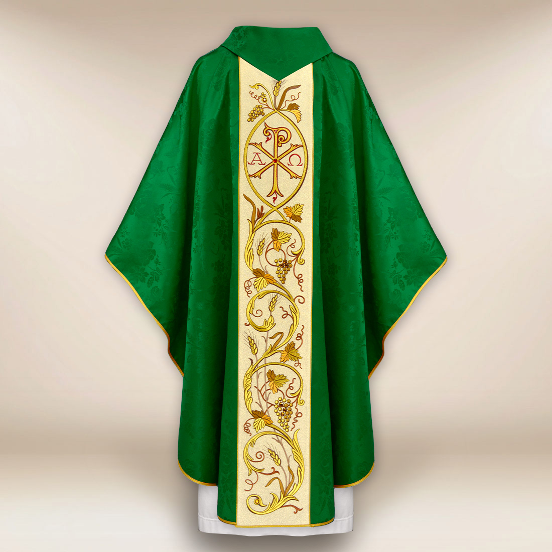 Il gallone centrale è ricamato su un tessuto chiaro con un sottile luccichio broccato, noto come “Nebbia Dorata”. Le pietre incorporate nell’ornamento evidenziano la luce e la profondità del simbolo principale – il cristogramma PX. Le decorazioni sono disposte con sensibilità: non dominano, ma rafforzano il carattere solenne del paramento, creando una composizione ideale per la liturgia del periodo ordinario e per celebrazioni di carattere pastorale.