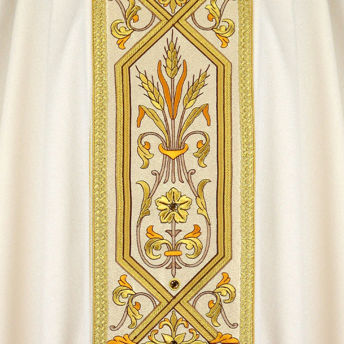 Il ricco pasem centrale presenta motivi floreali classici, realizzati con grande precisione e senso delle proporzioni. Il filo dorato che attraversa l’ornamento conferisce al motivo una profondità unica, mentre le pietre applicate a mano sottolineano il carattere solenne e liturgico del progetto. La composizione mantiene un equilibrio tra decoratività e sobrietà sacra, rendendo il paramento magnificamente visibile alla luce del presbiterio.