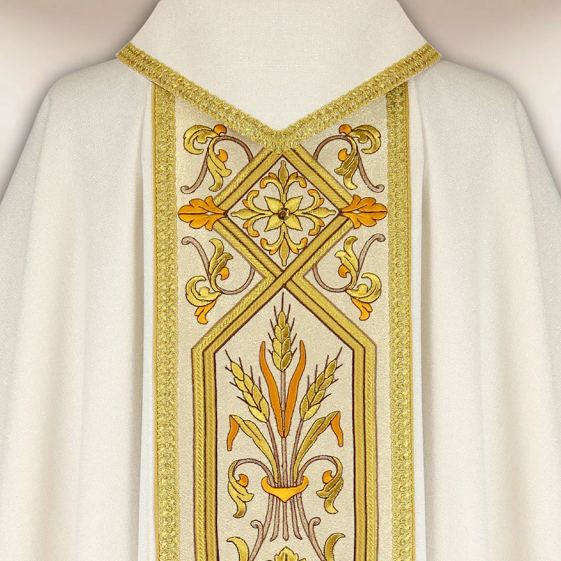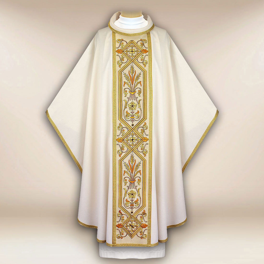 Il tutto è rifinito con passamaneria intrecciata italiana in una classica tonalità di oro antico, che aggiunge nobiltà ed eleganza alla casula. In dotazione c’è una stola interna abbinata, creando un insieme liturgico coerente. Casula ecru ricamata con pasem è la scelta ideale per i sacerdoti che apprezzano l’arte della manifattura, il design classico e un’estetica chiara e solenne. Prodotto realizzato da Urbanowicz Haft Polska.