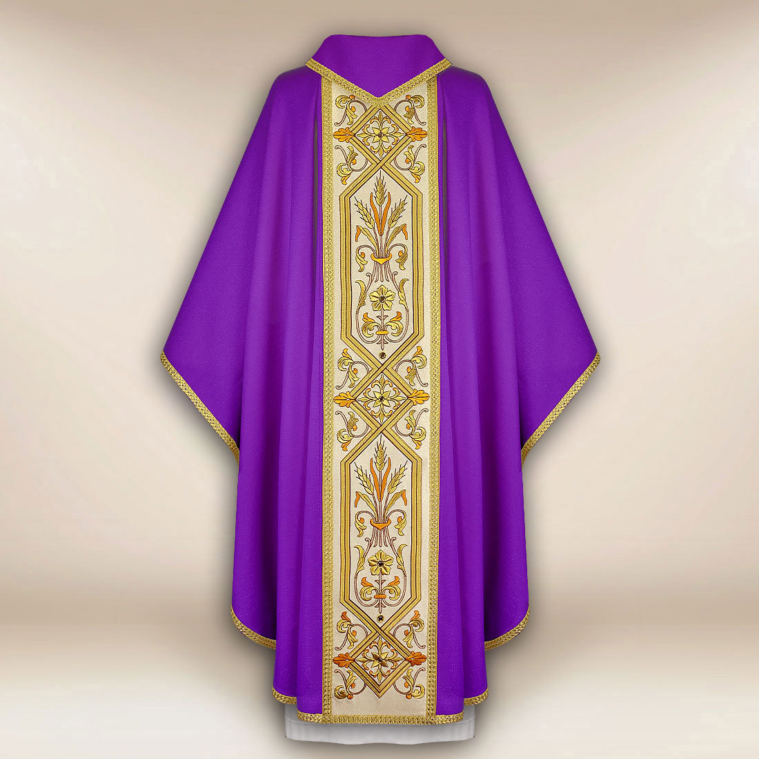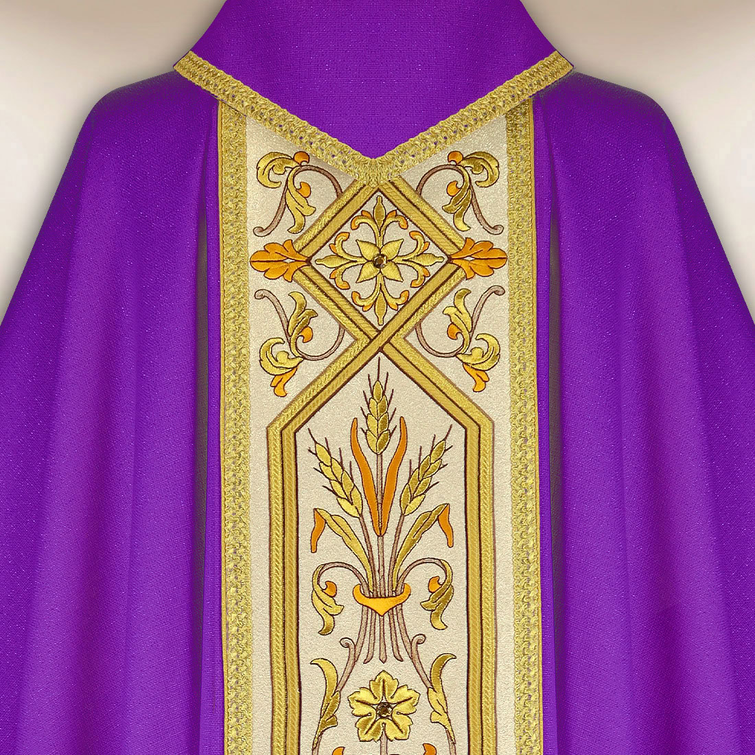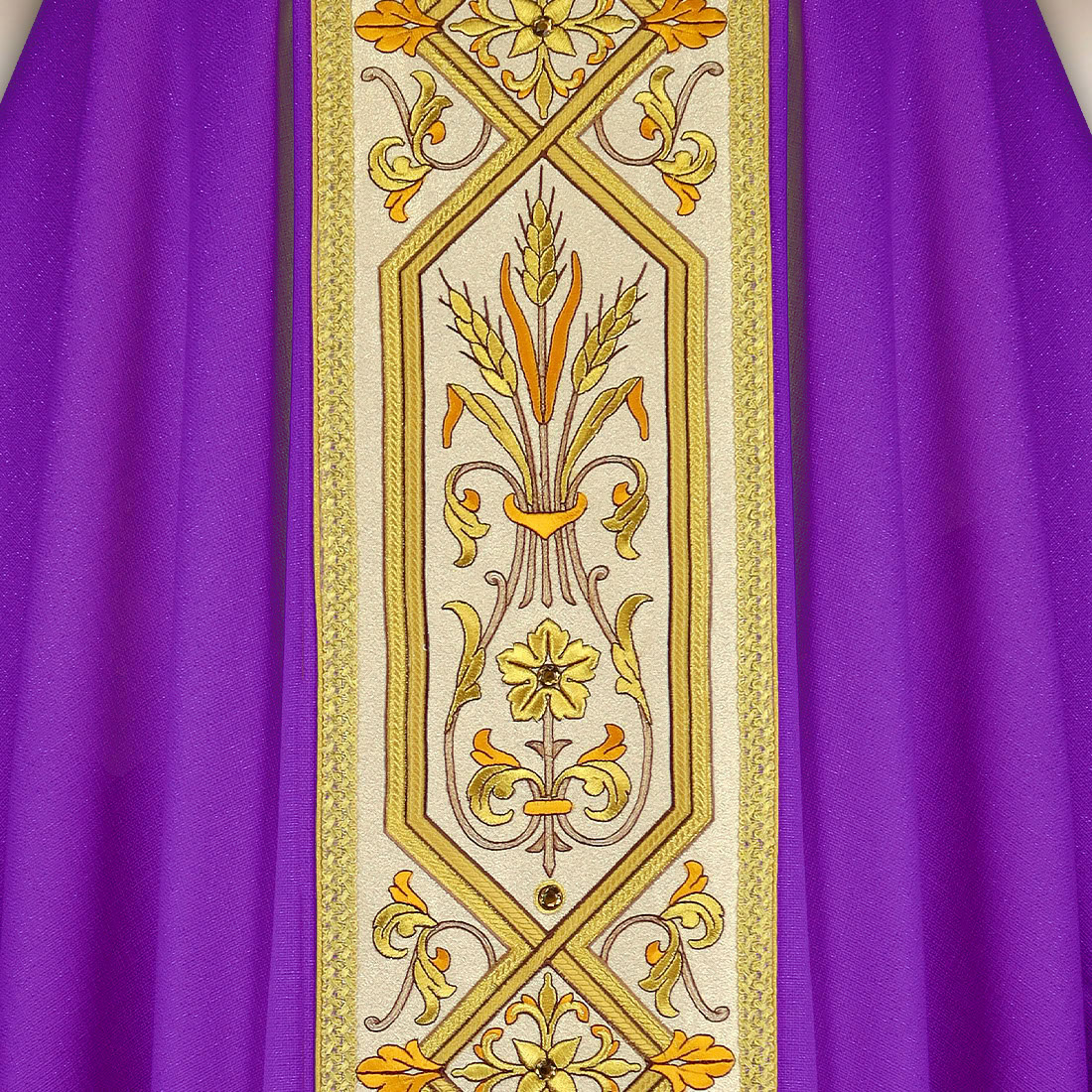 Casula viola ricamata con orphrey è un’elegante veste liturgica, progettata per celebrazioni solenni che richiedono un’eccezionale decorazione e profonda simbolica. Il tessuto è una miscela di fibre naturali (85% – viscosa, lino, seta) e sintetiche (15% – poliestere), garantendo durata e un aspetto elegante. Il materiale è morbido, leggero e piacevole al tatto, permettendo alla casula di cadere naturalmente e di presentarsi in modo straordinariamente dignitoso durante la liturgia.