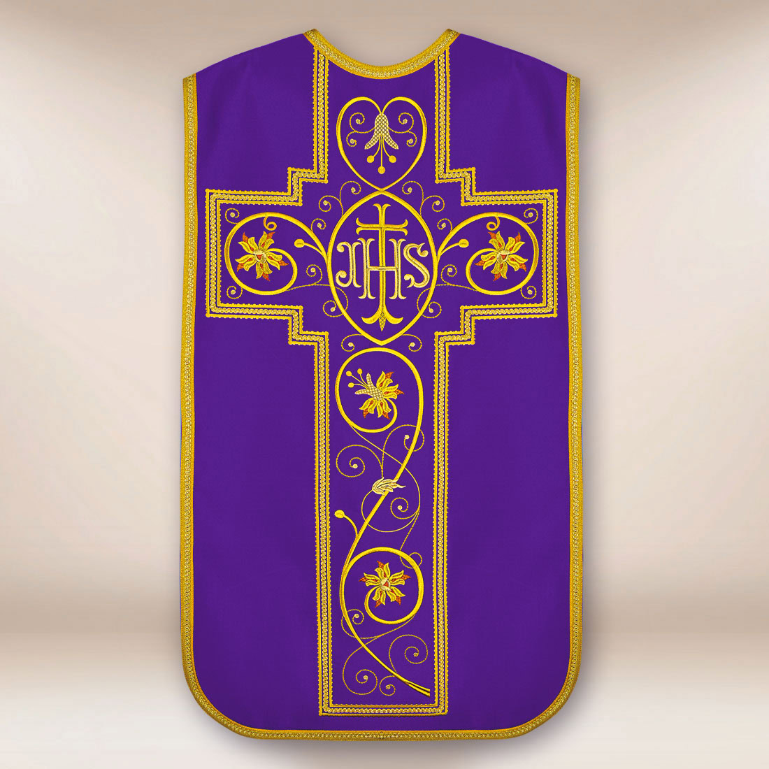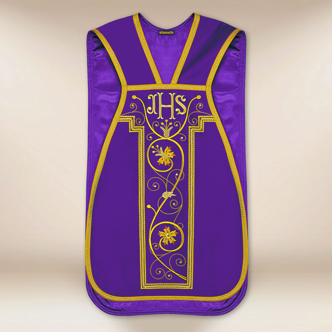 Casula romana di colore viola, decorata con ricamo dorato della croce e monogramma IHS.
