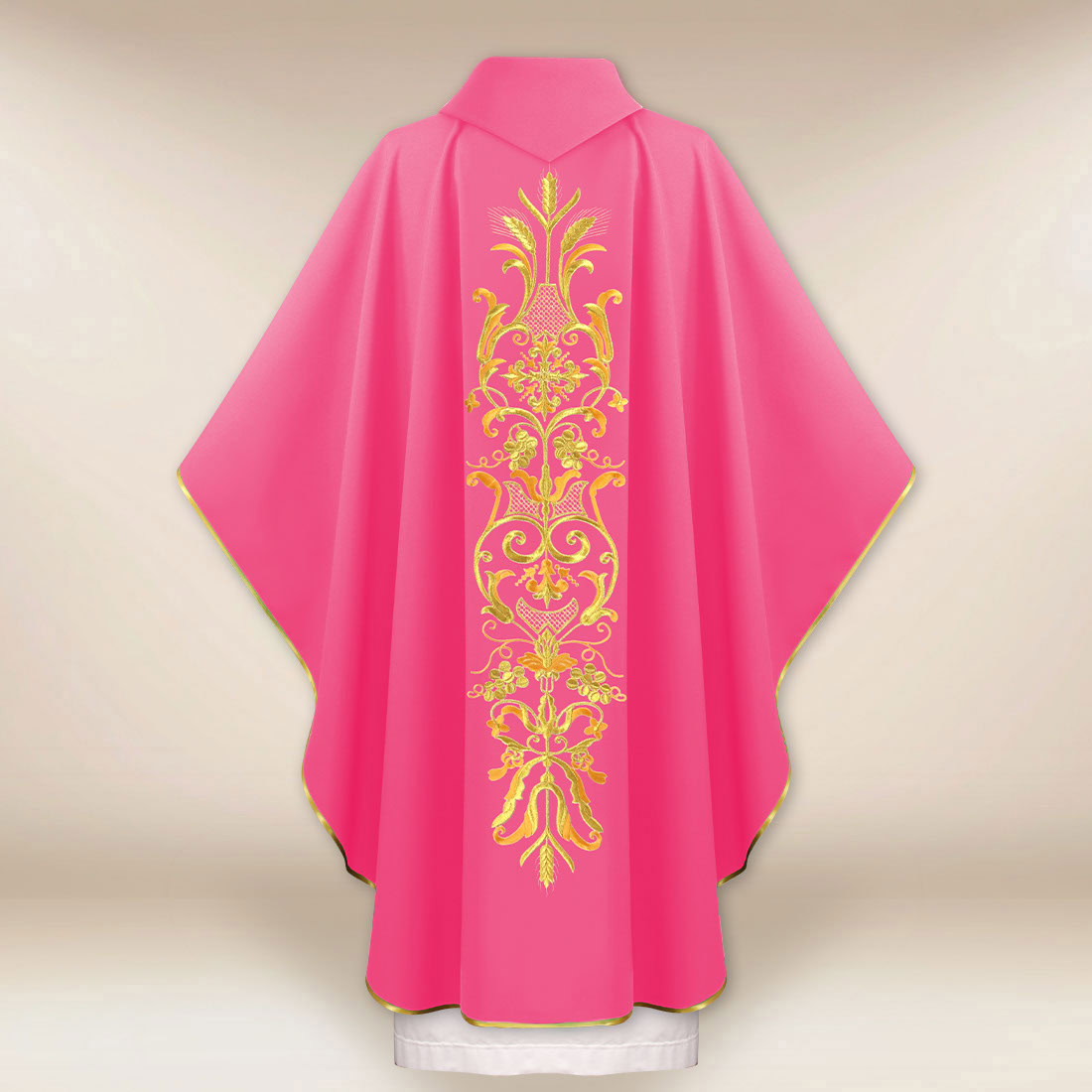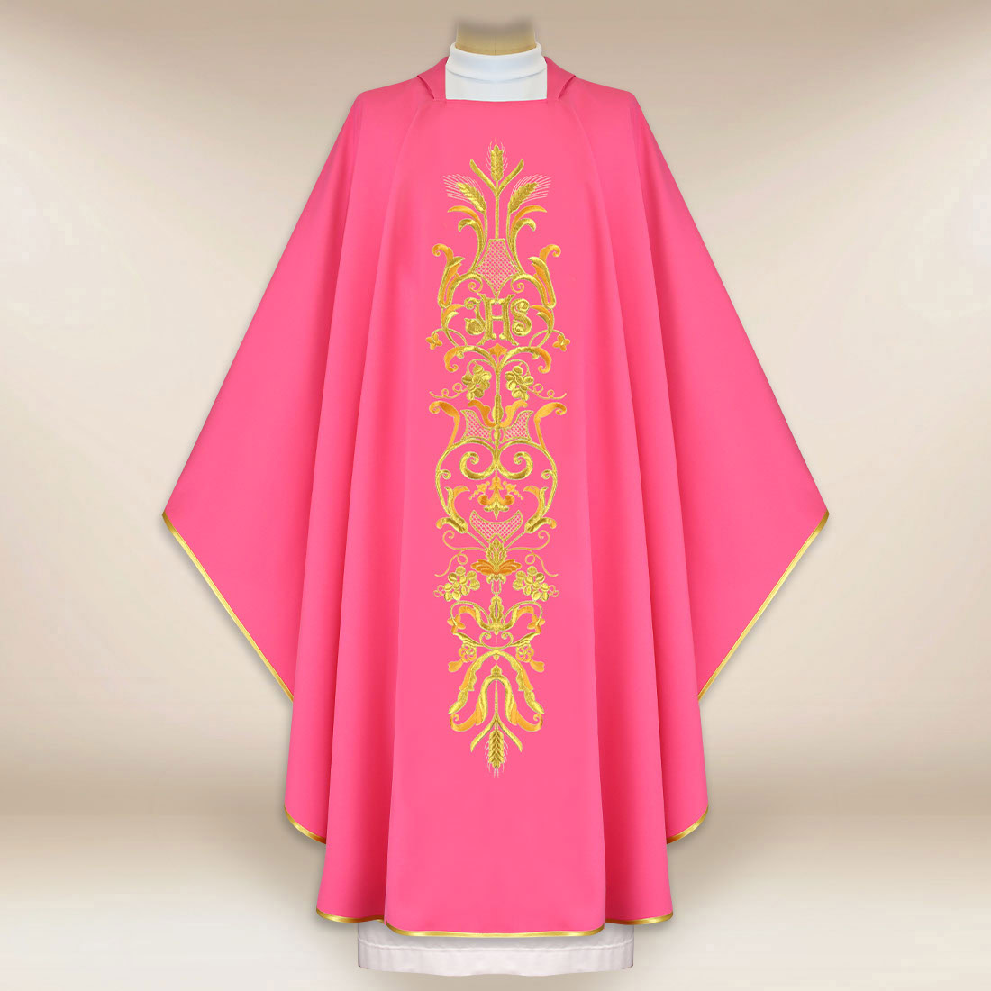Il colore rosa è un colore liturgico utilizzato durante la III Domenica di Avvento (Gaudete) e la IV Domenica di Quaresima (Laetare), dove simboleggia la gioia e la luce portate nel periodo di penitenza e attesa. Il ricamo è stato progettato con attenzione alle proporzioni e all’equilibrio della composizione, in modo da sottolineare il carattere sacro della veste, senza introdurre eccessiva decoratività.