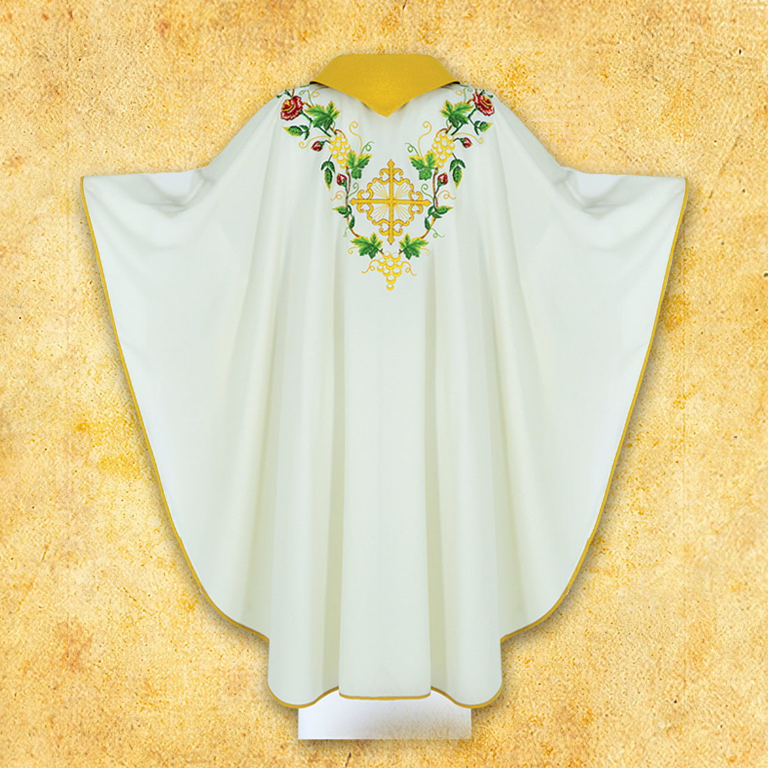 La taglia universale consente un adattamento naturale della casula a qualsiasi silhouette, e la leggerezza del tessuto fa sì che il paramento non appesantisca e rimanga confortevole anche durante le celebrazioni di molte ore. Grazie a ciò, casula ricamata rosae diventa una scelta eccellente per celebrazioni di carattere solenne – dalle festività parrocchiali, ai giubilei, fino alle liturgie eucaristiche speciali.