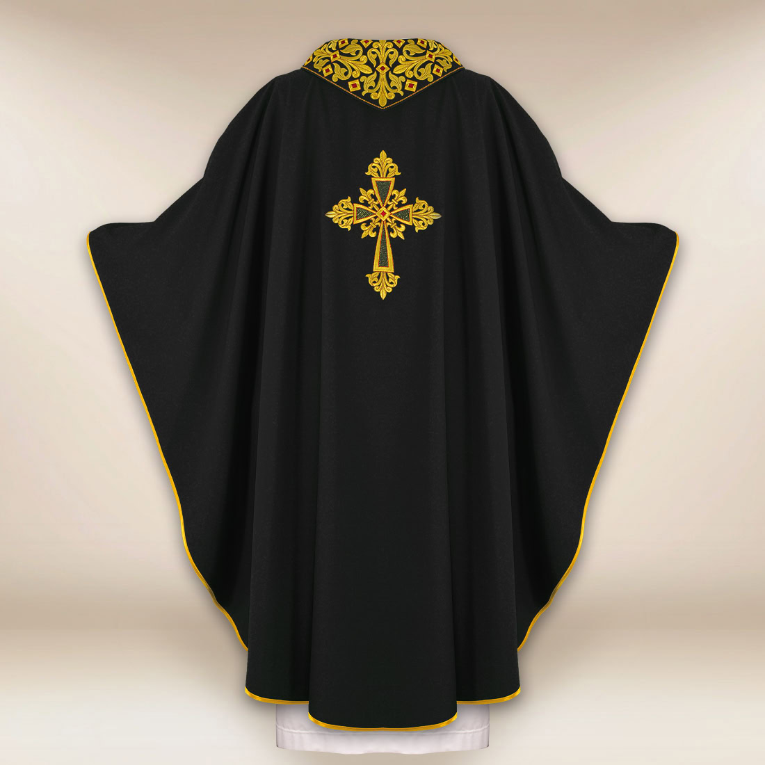 La casula ricamata con IHS nera è realizzata in tessuto di alta qualità Tropic Italiano – un materiale leggero, traspirante e che si adatta molto bene durante il movimento. Grazie a una miscela adeguata di fibre, il tessuto è resistente alle pieghe, mantiene la sua forma ed eleganza a lungo ed è facile da curare quotidianamente.