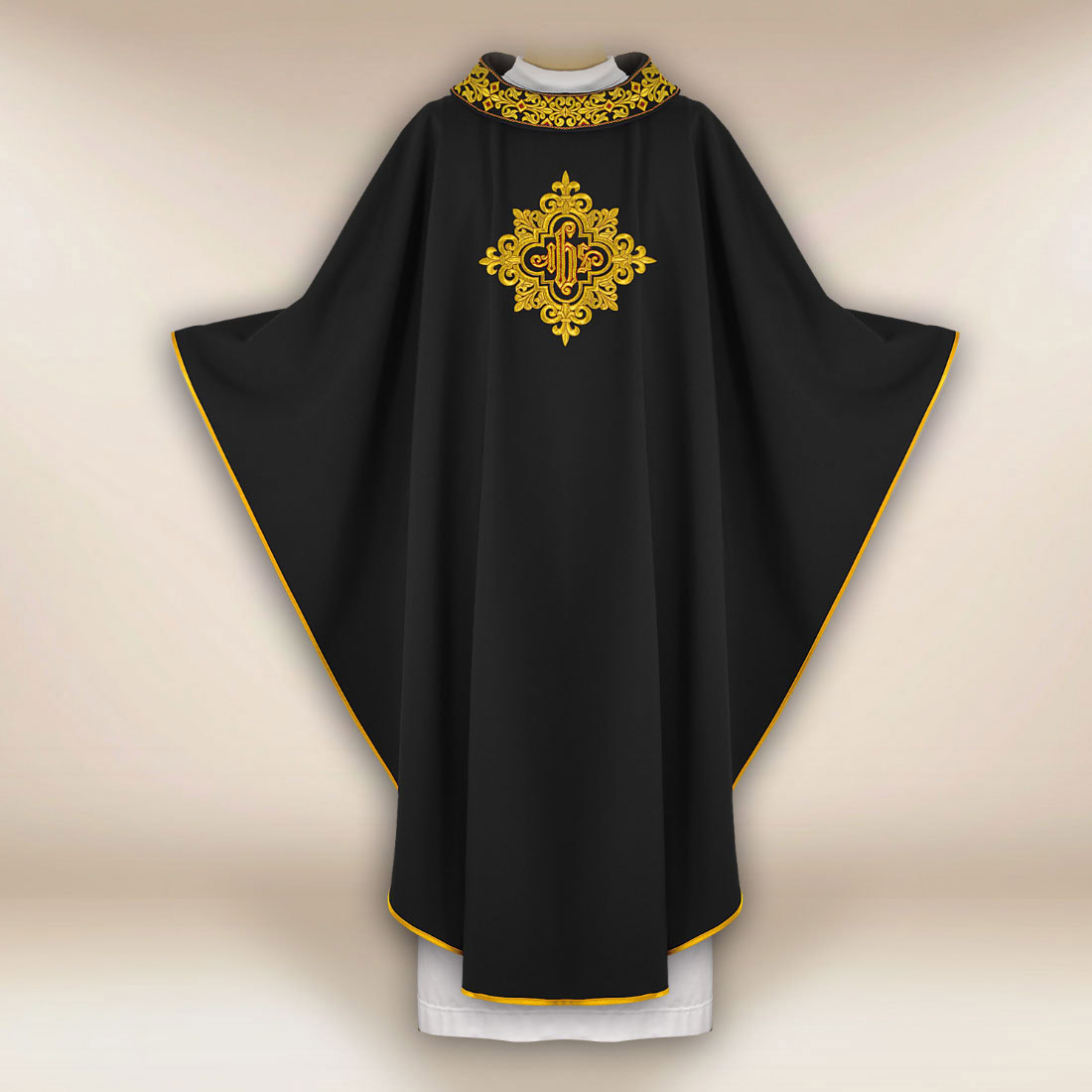 La casula ricamata con IHS nera è un’eccezionale veste liturgica destinata in particolare alla celebrazione delle Messe di carattere funebre, commemorativo e nelle celebrazioni della Commemorazione dei Defunti. Il classico colore nero sottolinea la gravità della liturgia, mantenendo al contempo una forma di piena dignità e nobiltà.