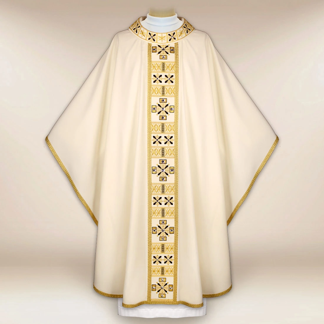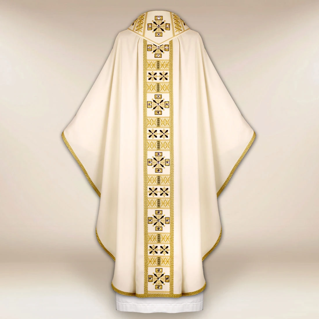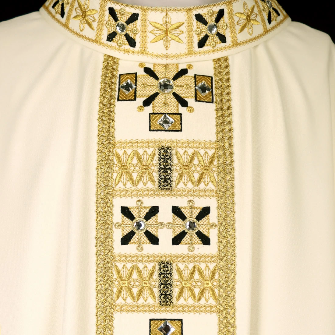Le pietre applicate a mano in tonalità oro antico conferiscono alla veste un delicato splendore, creando un accento che non domina il progetto, ma lo arricchisce. La bordatura in passamaneria italiana intrecciata conferisce alla veste una linea definita e un’ulteriore sottolineatura dei contorni. Tutti gli elementi si uniscono in un progetto che è al contempo solenne, sereno e pieno di dignità liturgica.