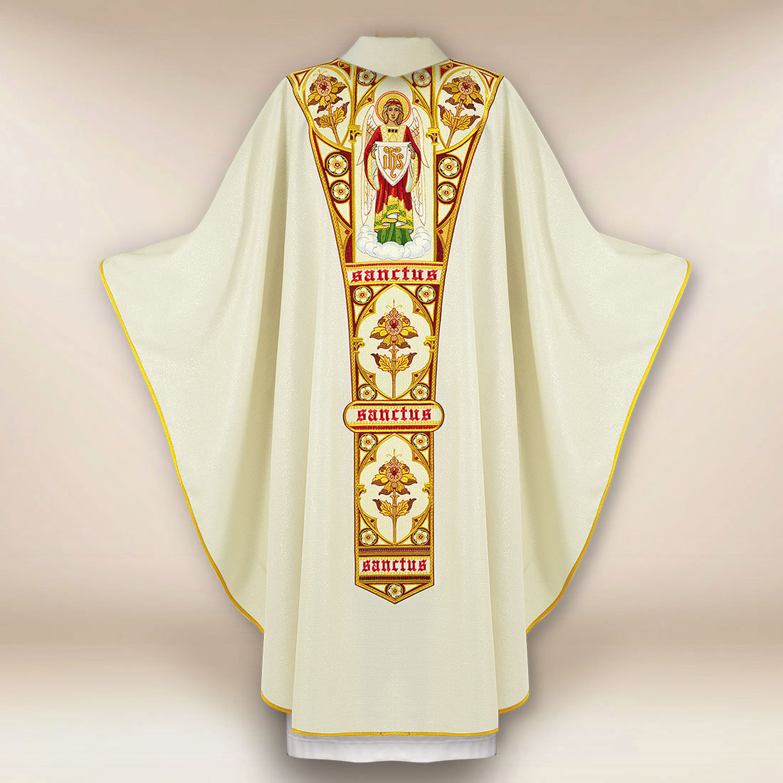 Casula liturgica Santissima Trinità ricamata è un vestimento progettato per i sacerdoti che apprezzano l’eleganza, la simbologia e la massima qualità di realizzazione. Il modello è realizzato in tessuto Sacroline, delicatamente intrecciato con filo dorato, conferendo un sottile lucido e un carattere armonioso e solenne. Il materiale è eccezionalmente morbido, elastico e leggero, garantendo comfort anche durante lunghe celebrazioni. La sua caduta fluida sottolinea la linea dignitosa del taglio e la forma classica della casula.