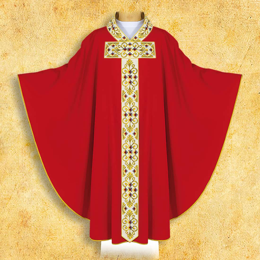 La casula ricamata rossa è un elegante paramento liturgico realizzato in tessuto di alta qualità con una struttura morbida e leggera, che si adatta perfettamente durante le celebrazioni.
