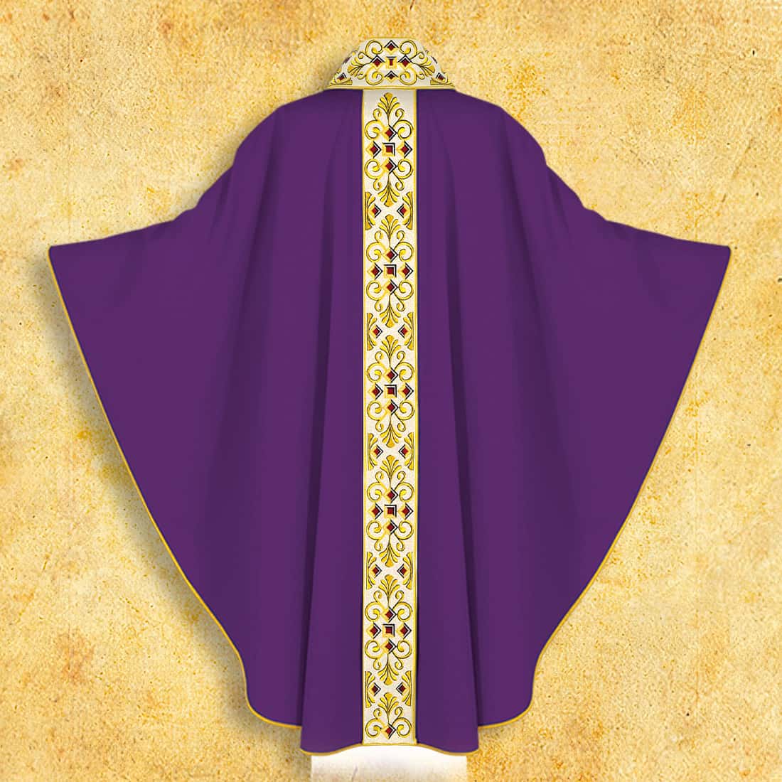 Casula ricamata viola è stata progettata per garantire libertà di movimento al sacerdote e una presenza eccellente nel presbiterio e durante le processioni. È inclusa una stola interna coordinata, che crea una composizione elegante e armoniosa. Il paramento ha una taglia universale, permettendo un adattamento perfetto a ogni figura.