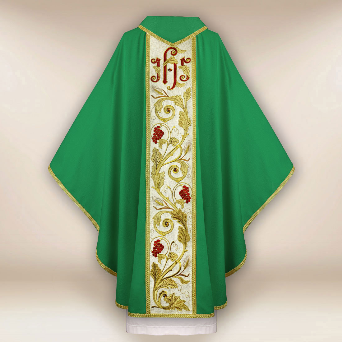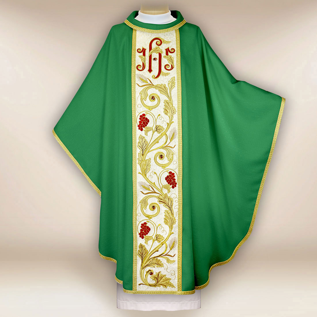 Casula liturgica verde “Tradizionale”, decorata con il simbolo IHS e motivi di grappoli d’uva e ornamentazione floreale.