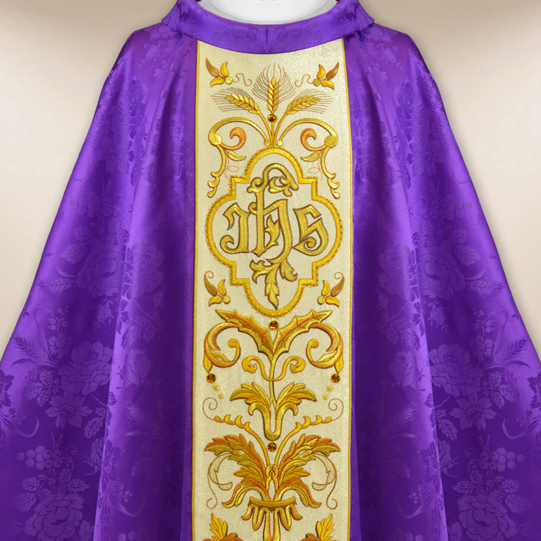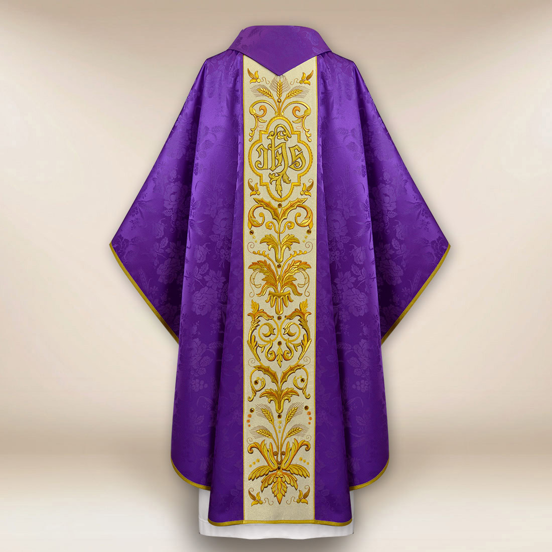 Il pannello centrale della casula è decorato con un ricamo elaborato con il monogramma IHS – simbolo del Nome di Gesù – circondato da un classico ornamento vegetale di ricca simbologia. Il design è stato progettato per mantenere un equilibrio tra eleganza e serietà liturgica. Il ricamo è vivido, realizzato con cura e si integra armoniosamente nella composizione della veste, rendendolo leggibile sia alla luce della chiesa che durante le processioni.