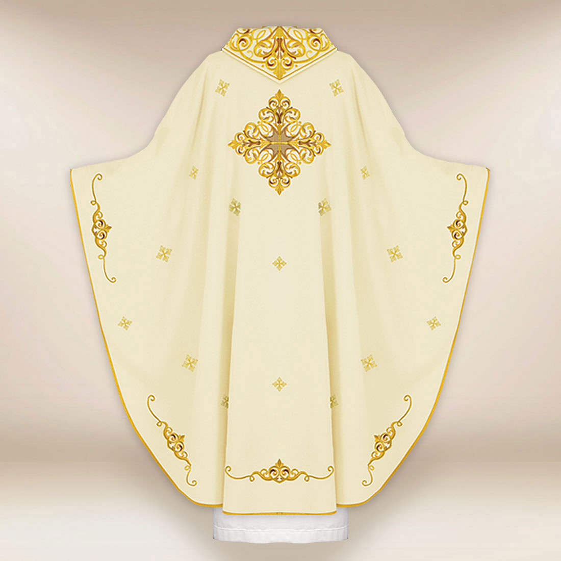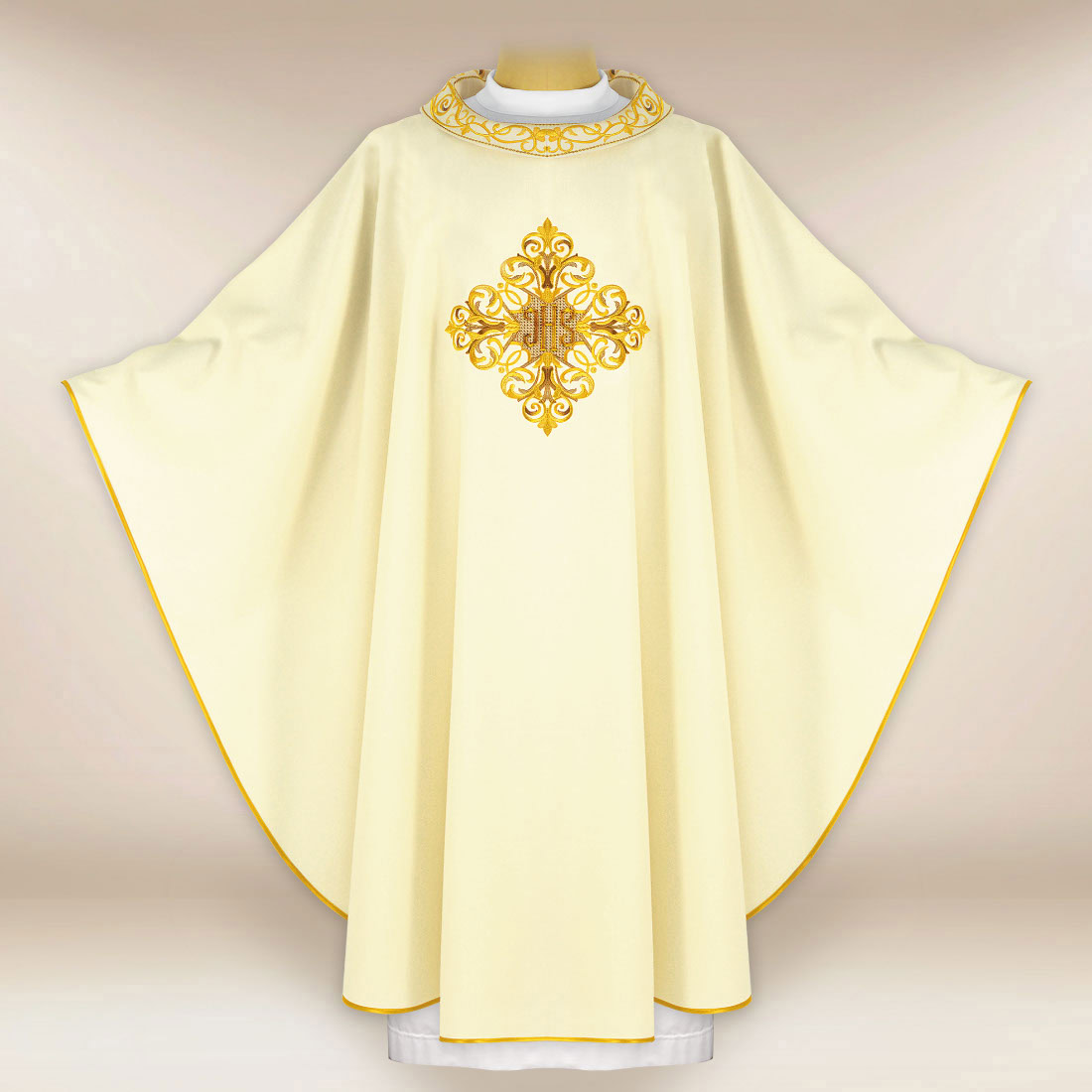 La forma curata, il ricamo elegante e il materiale accuratamente selezionato fanno sì che casula liturgica con ricamo IHS rappresenti una bella fusione di tradizione, estetica e funzionalità. È un abito che esprime pienamente il carattere del ministero sacerdotale e sottolinea il sacro di ogni liturgia.