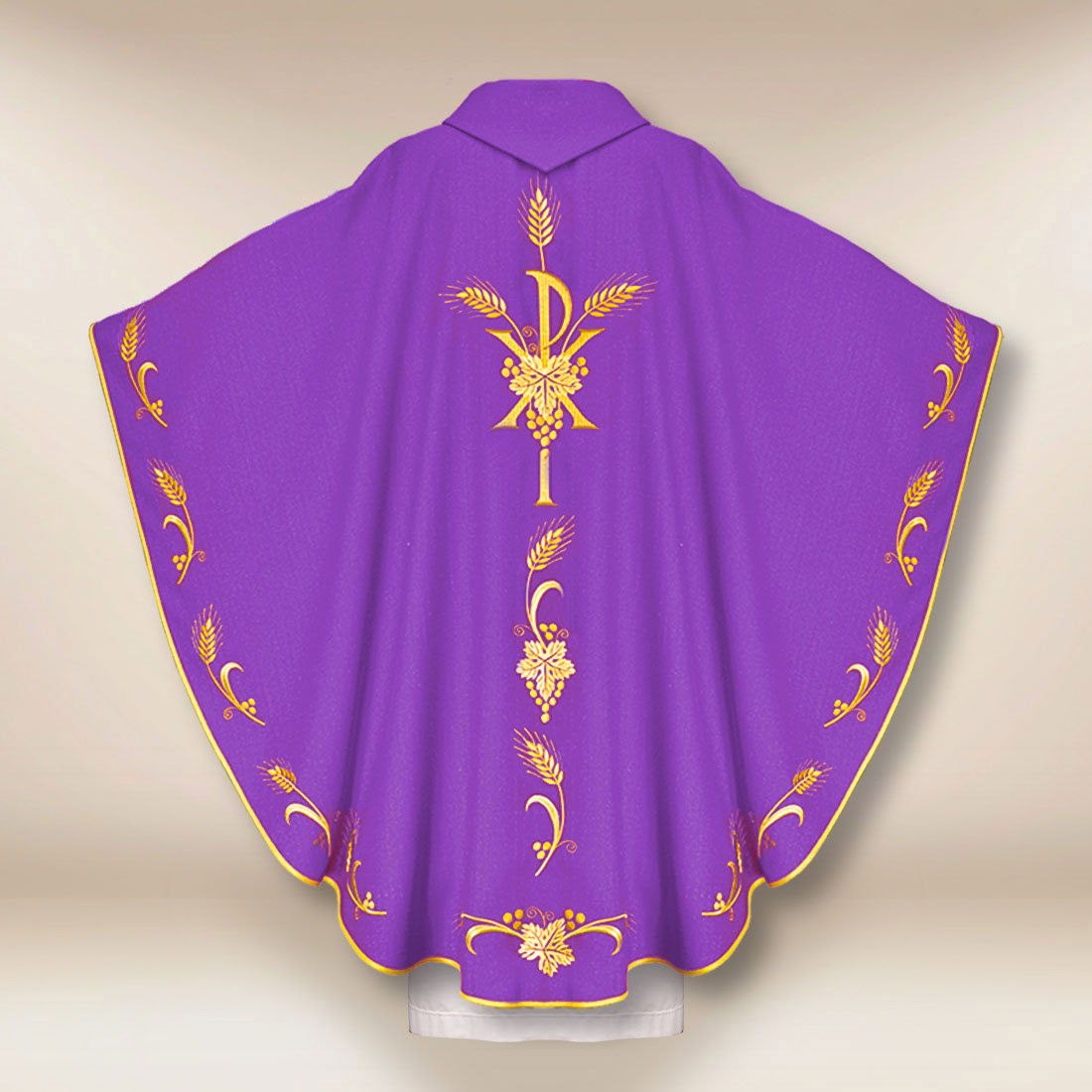 L’elemento centrale della decorazione è il ricamo PX, un antico cristo-gramma e simbolo della vittoria di Cristo Risorto. Posizionato sia sul davanti che sul retro della casula, crea una composizione liturgica vivace che introduce nella celebrazione una profondità spirituale e teologica. I fili dorati sottolineano il carattere sacro del motivo, conferendogli una delicata lucentezza visibile sia alla luce del giorno che nell’illuminazione ecclesiastica.