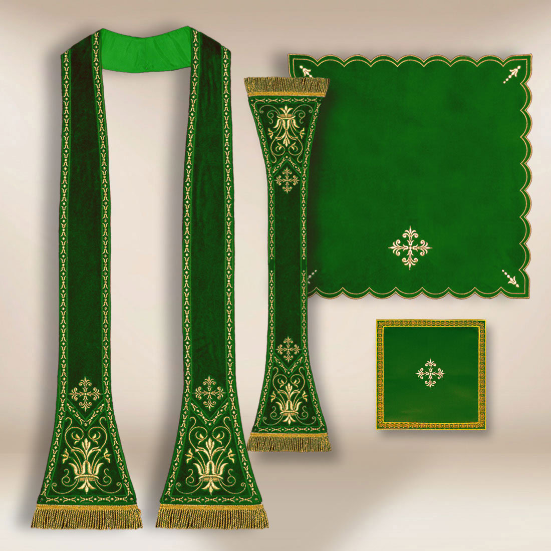 Il verde nella liturgia simboleggia la speranza, la crescita e la perseveranza nella fede. Combinato con la morbida e opaca struttura del velluto di cotone, crea una composizione equilibrata e dignitosa. Il tessuto reagisce sottilmente alla luce, conferendo profondità al paramento, mantenendo al contempo un’eleganza moderata propria della celebrazione quotidiana.
