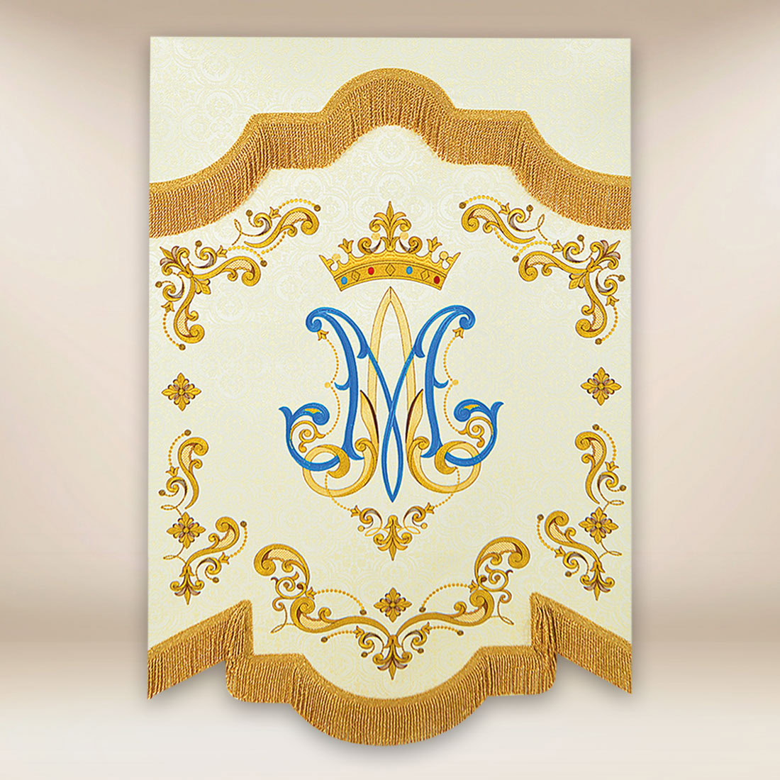 Le decorazioni dorate, i dettagli ornamentali e le finiture con Frangia sottolineano il carattere solenne dello stendardo e lo rendono unico nelle processioni e durante le feste parrocchiali. La doppia faccia dello stendardo garantisce un’ottima visibilità dell’immagine indipendentemente dalla direzione in cui viene portato, cosa particolarmente importante durante le processioni liturgiche e le cerimonie.